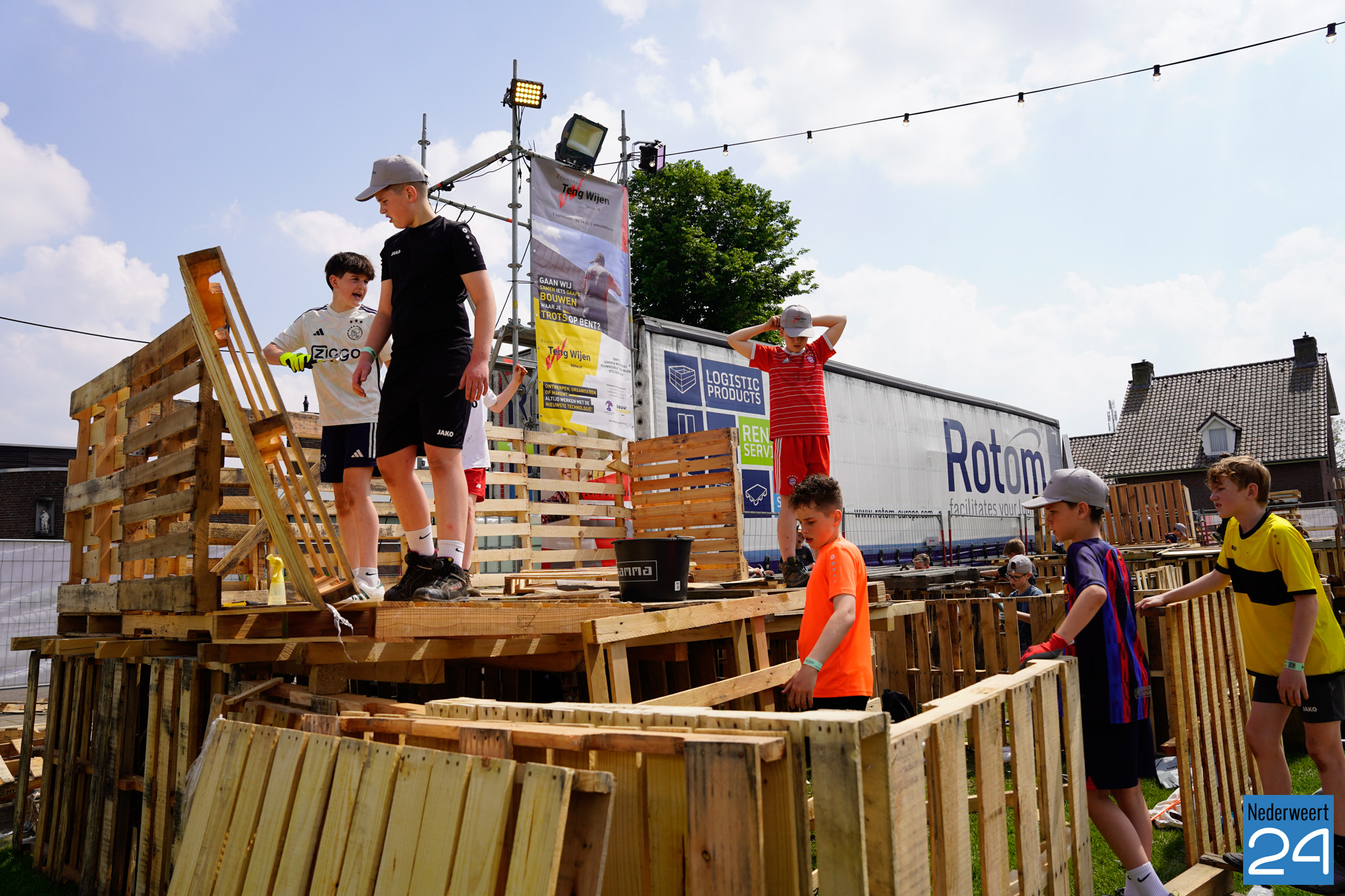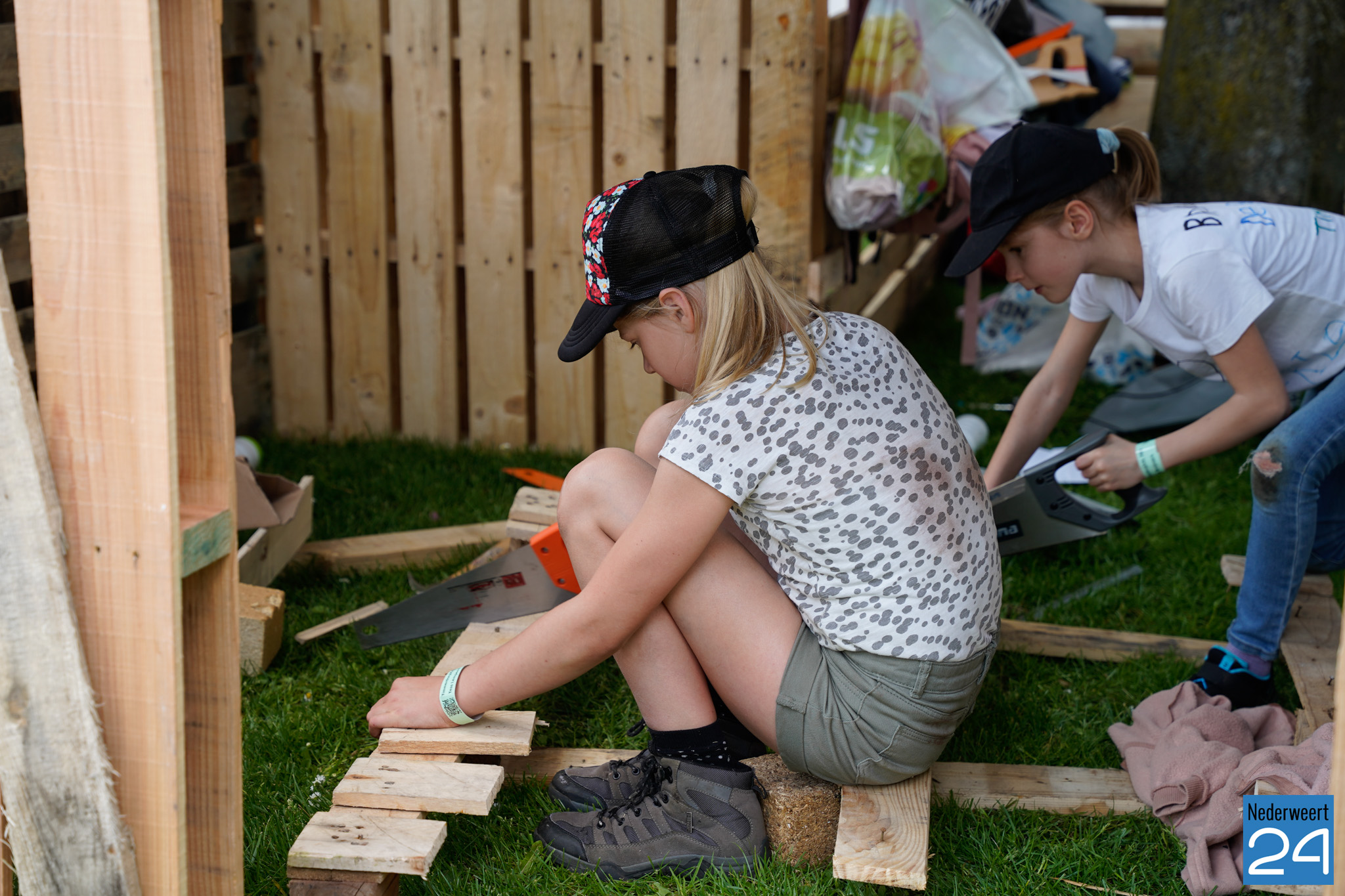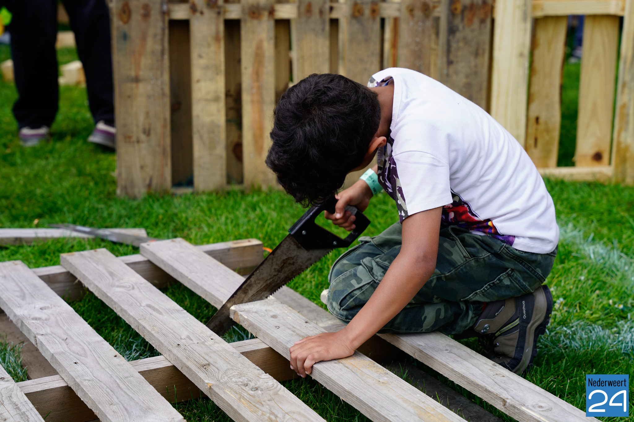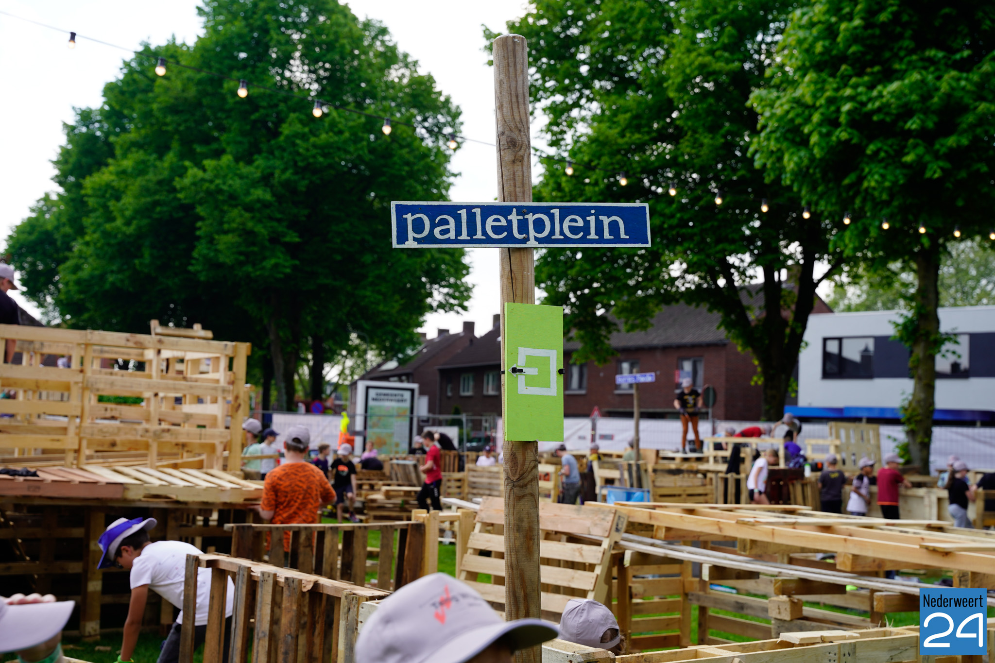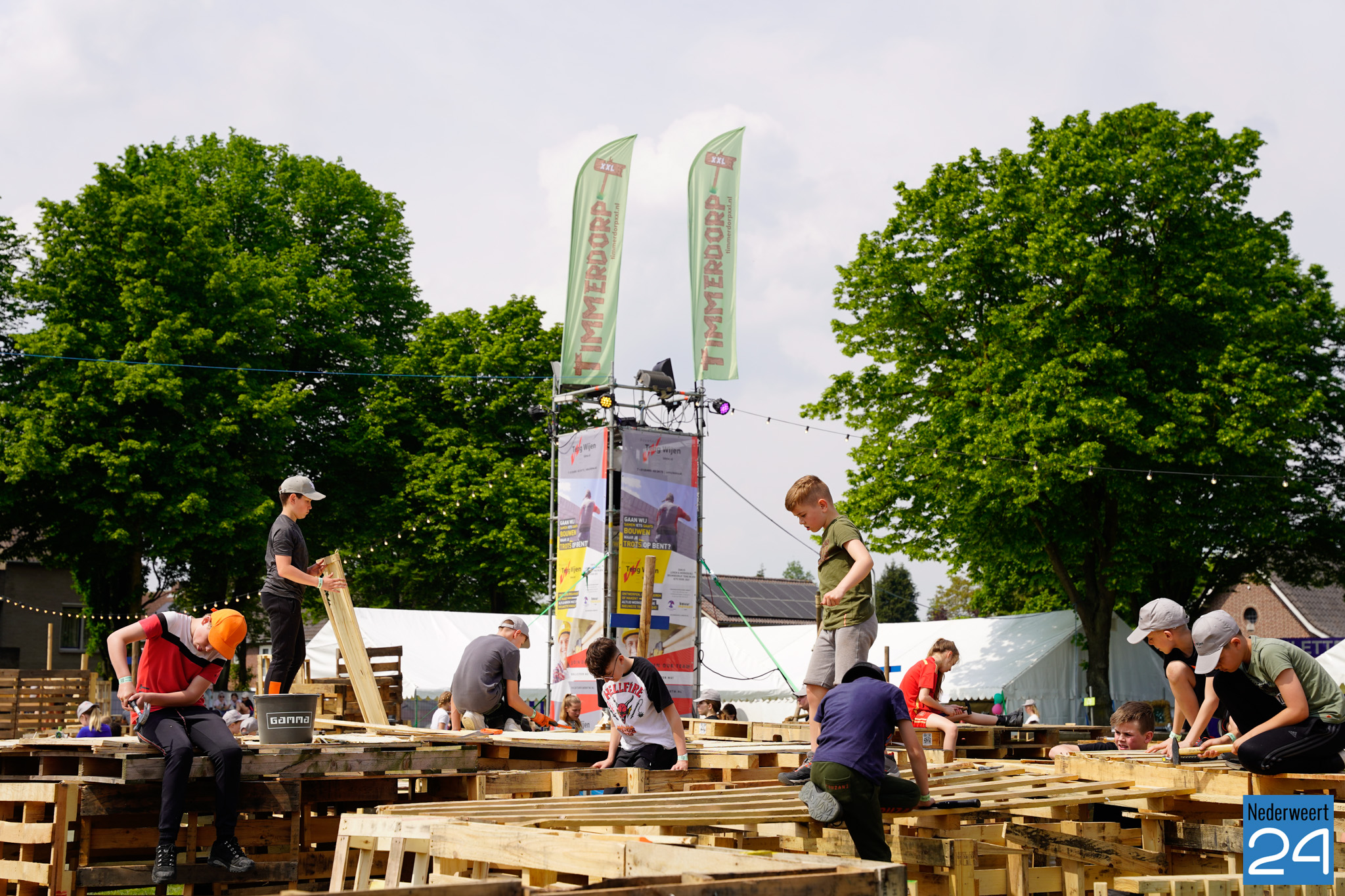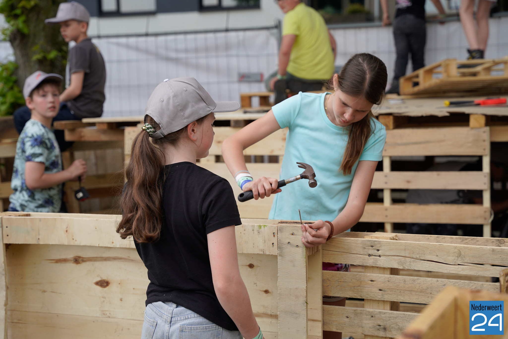 Het Sint Rochusplein in Budschop is weer omgetoverd tot timmerdorp, kinderen van groep 4 t/m 8 mogen in groepjes van 4 tot 12 personen verdeeld over ongeveer 45 kavels hun eigen ontworpen “palletwoning” gaan realiseren.