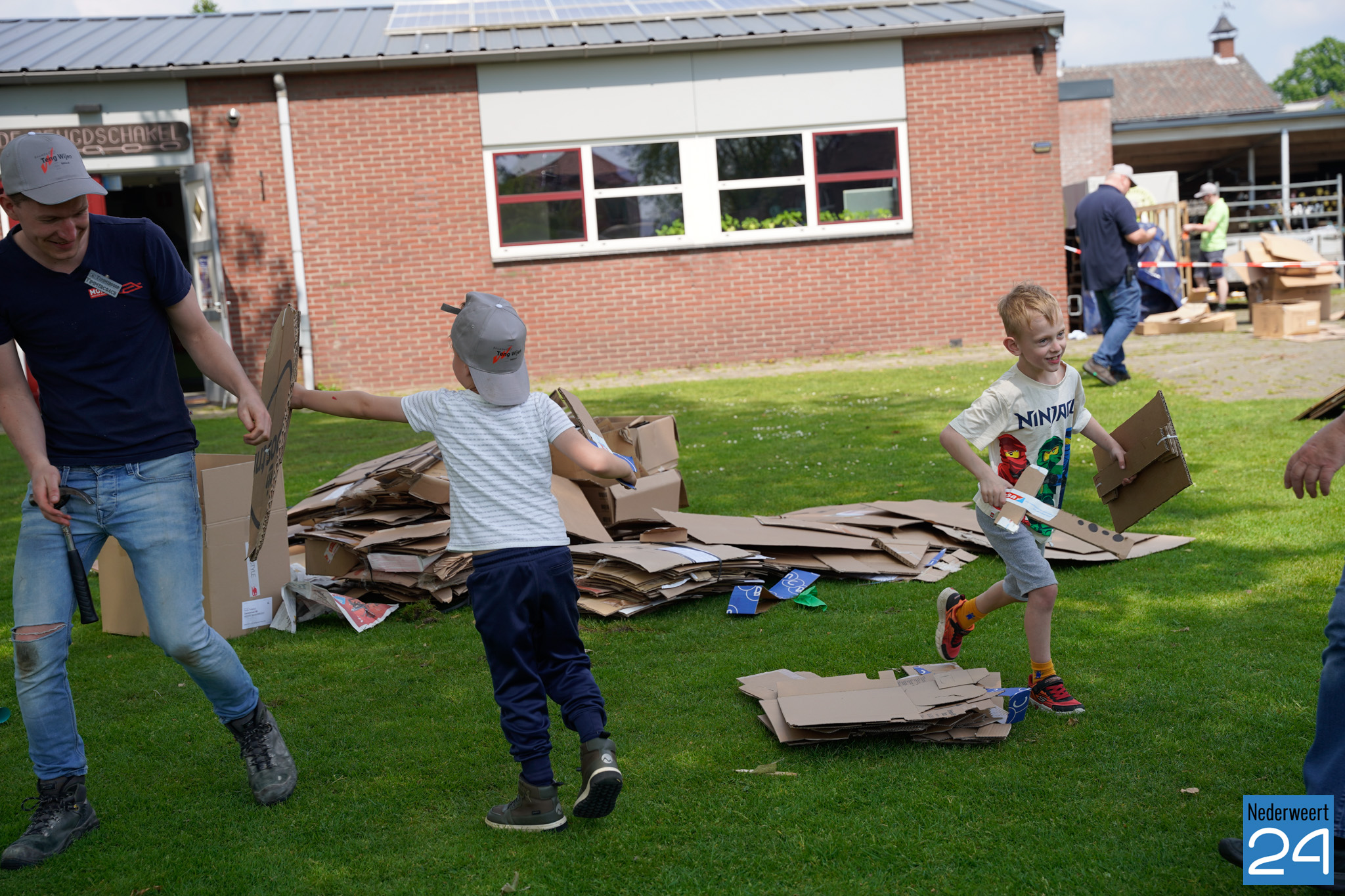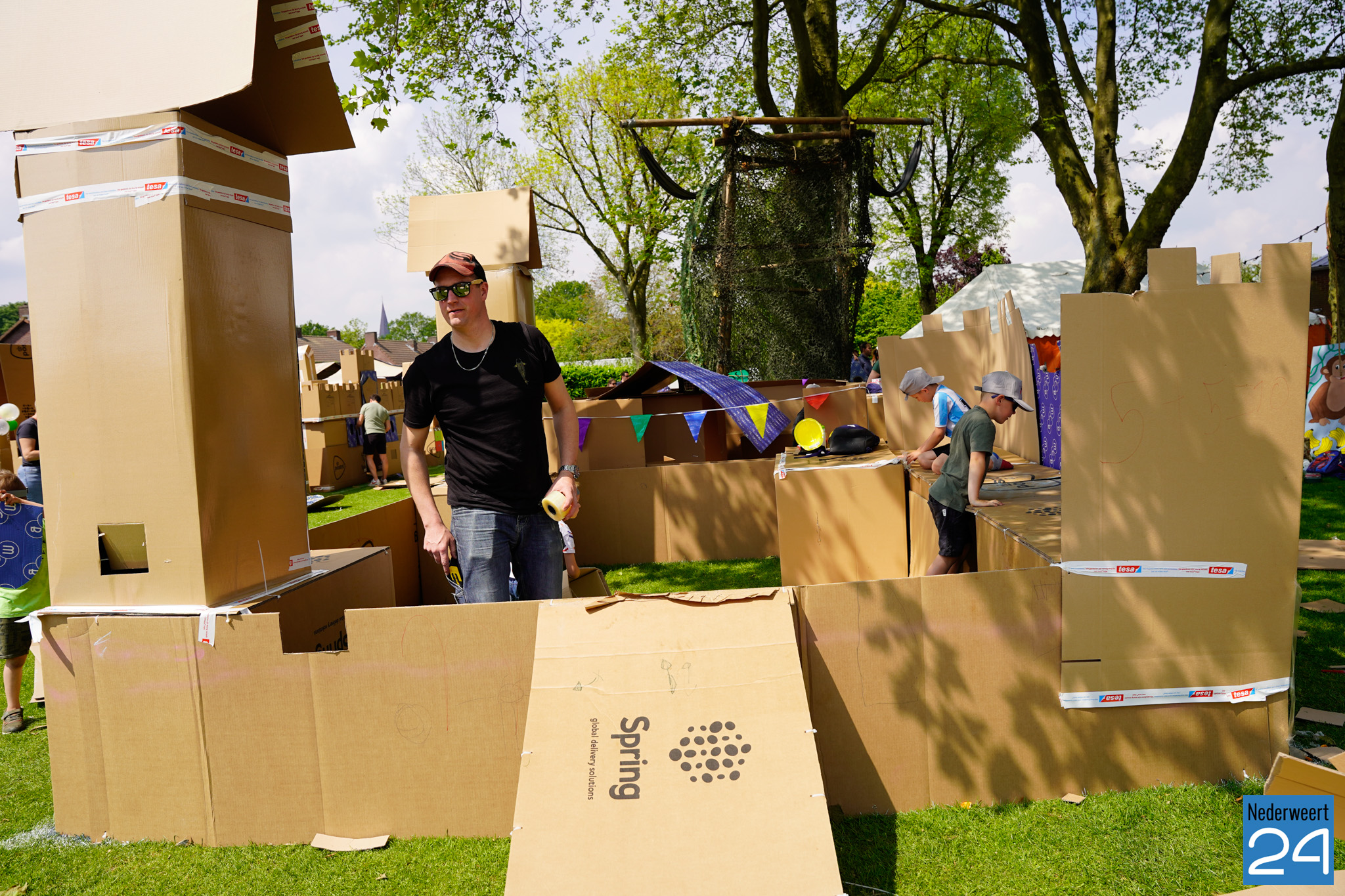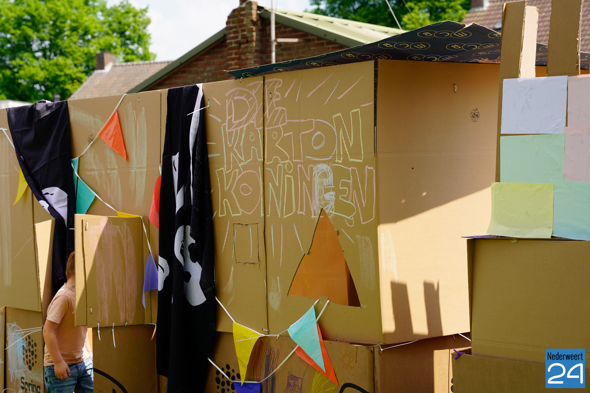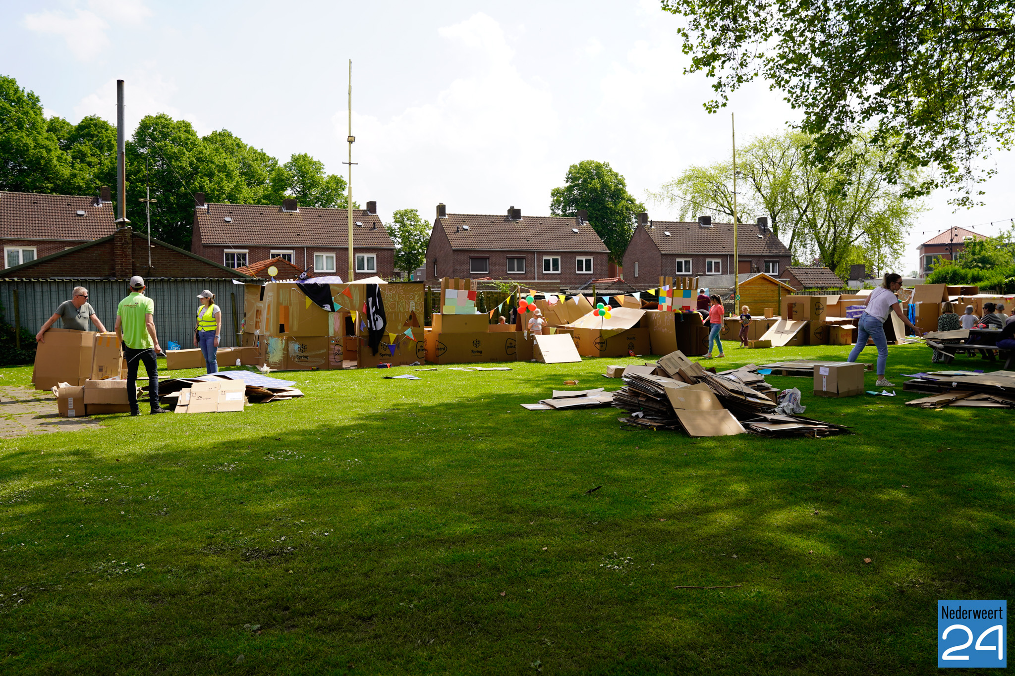 Voor de kinderen van groep 1 t/m 3 die nog niet mee mogen doen met TimmerdorpXXL maar wel hun eigen hut willen bouwen is het terrein van Jong Nederland Budschop gereed gemaakt om met dozen een hut te bouwen.