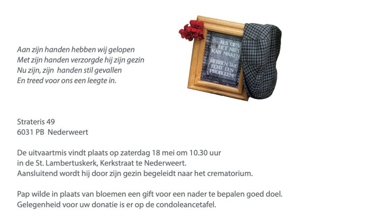 En voor de nabestaande heel veel en kracht om samen door te gaan..