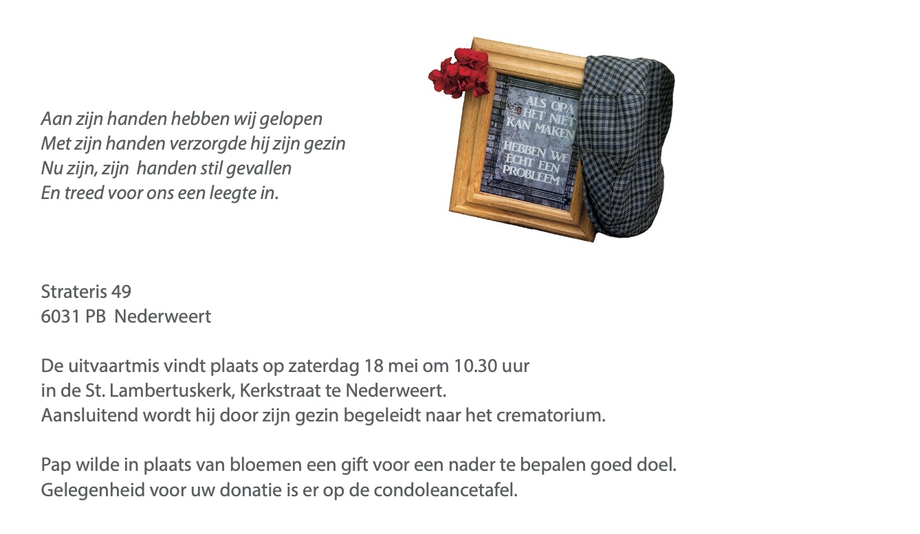 Gecondoleerd met het overlijden van jullie vader schoonvader en opa. Hij was een