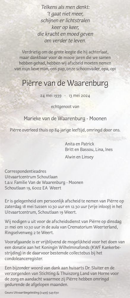 overlijden Pierre en heel veel sterkte gewenst in deze voor jullie moeilijke tijden.