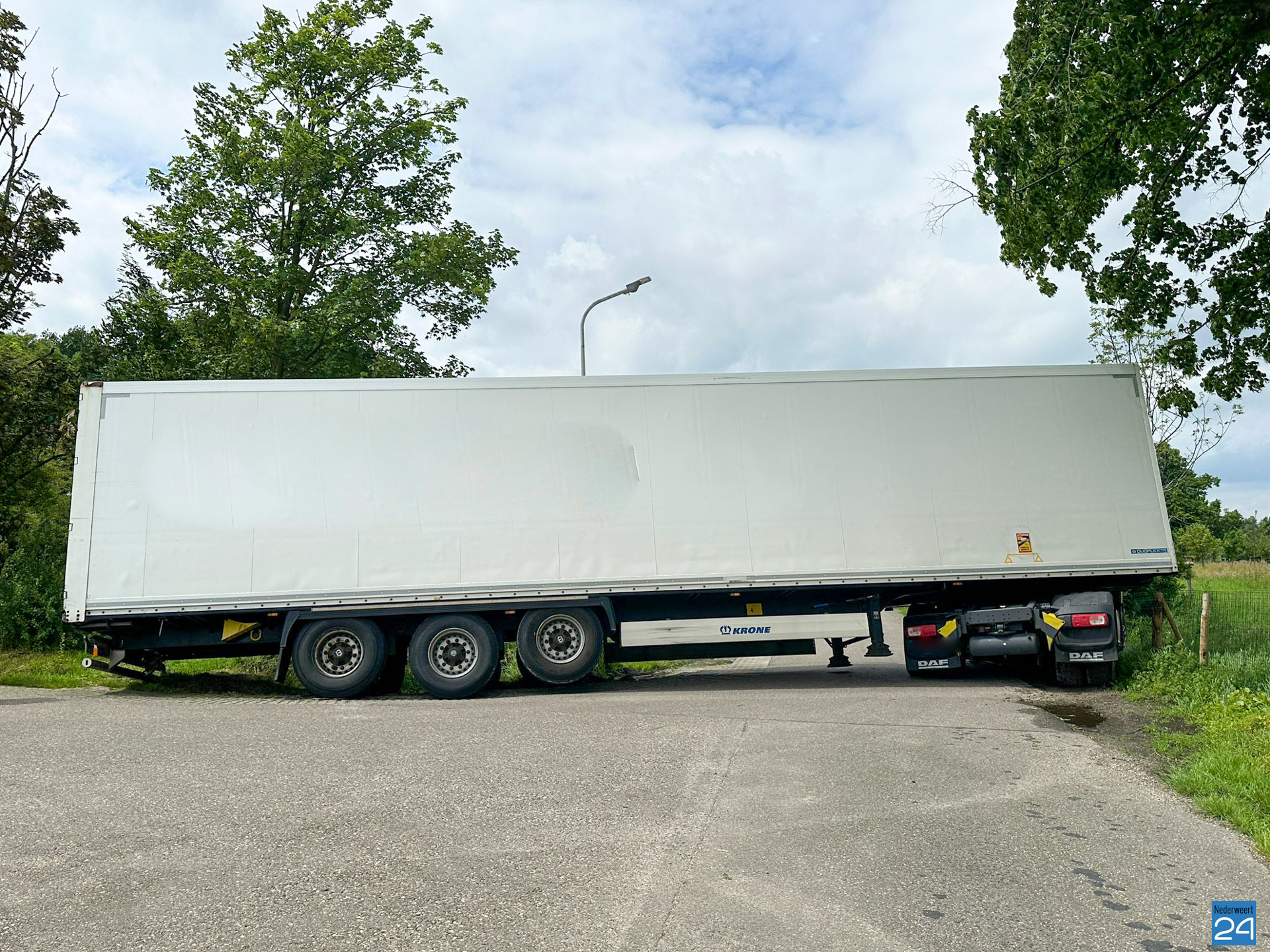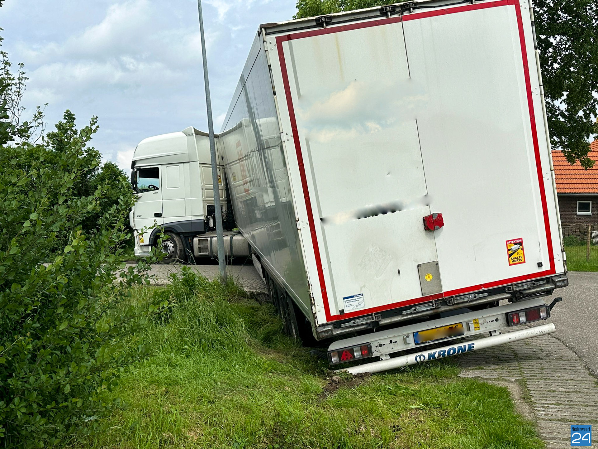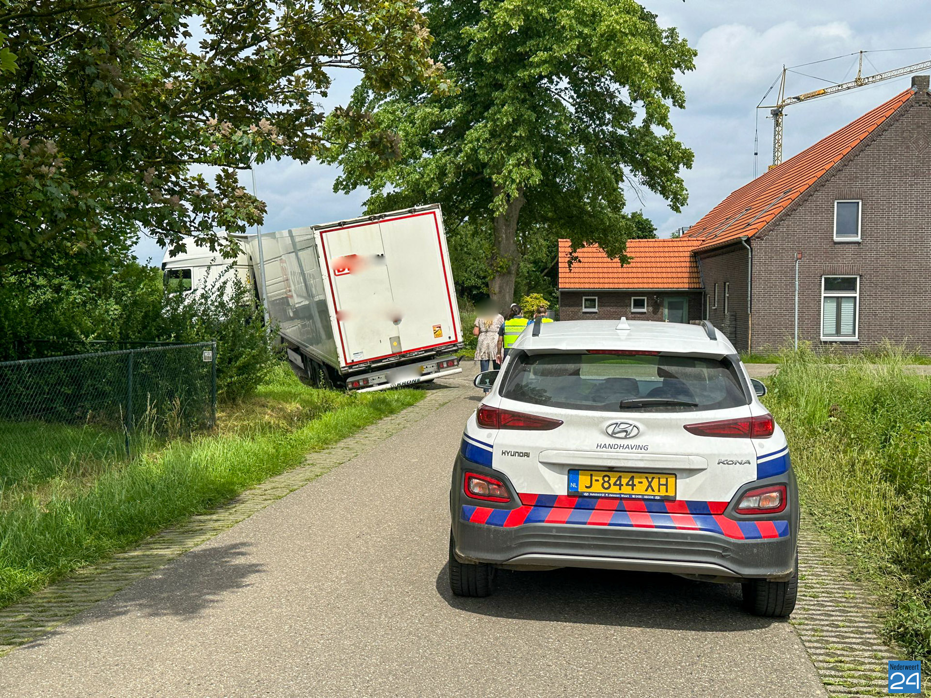 Een vrachtwagen heeft zich woensdagmiddag vastgereden in een greppel op de kruising Rakerstraat met de Thomassenweg in Laar, Weert.