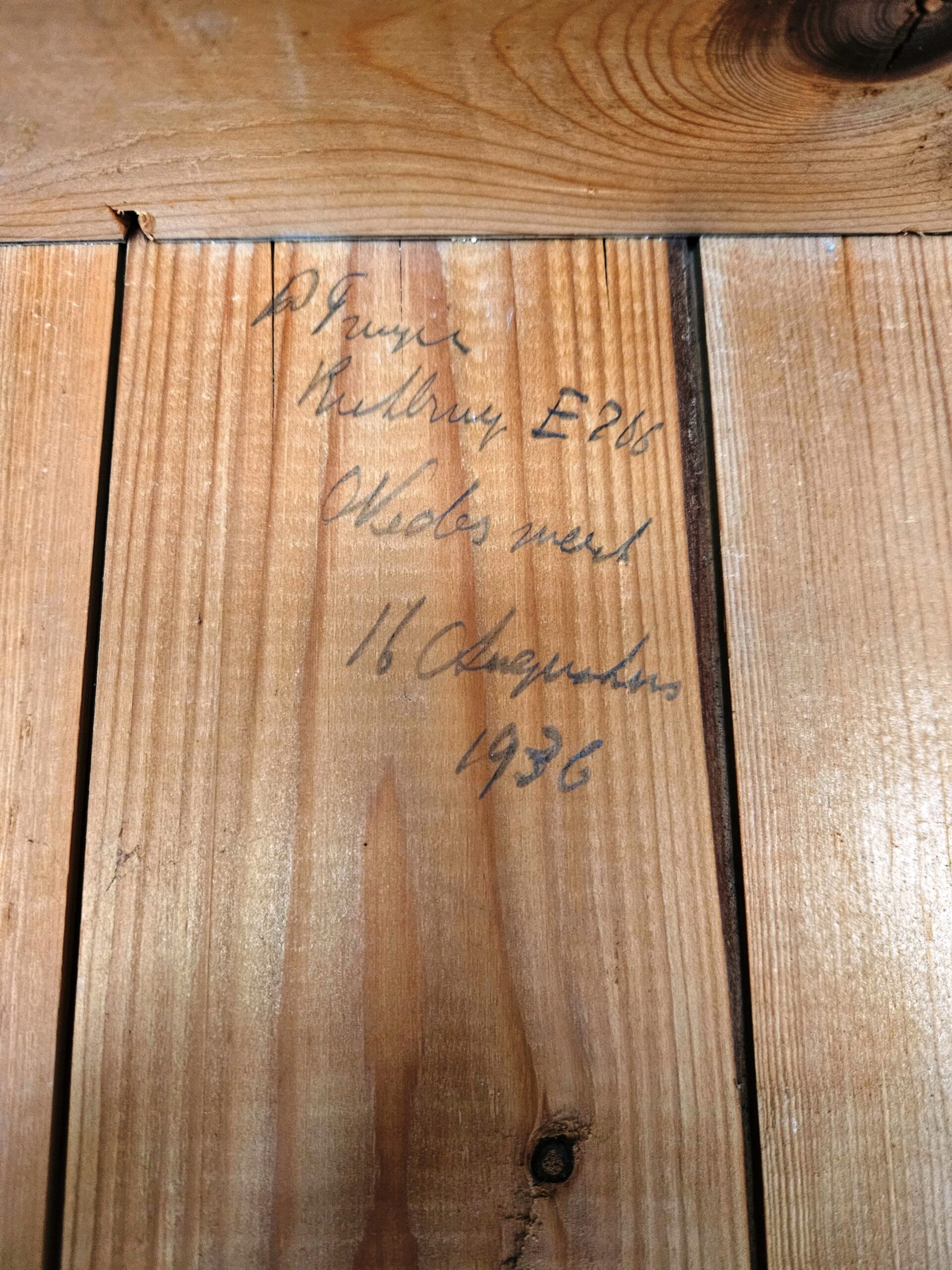In het gedeelte van het pand waar meester Nieskens en zijn gezin woonden, zijn de inscripties gevonden. Die bestaan uit een aantal namen en teksten, vermoedelijk achtergelaten door timmerlieden en bouwvakkers bij de bouw. De duidelijkste tekst spreekt voor zich: ‘P. Truijen Rietbrug E206 Nederweert 16 augustus 1936’.