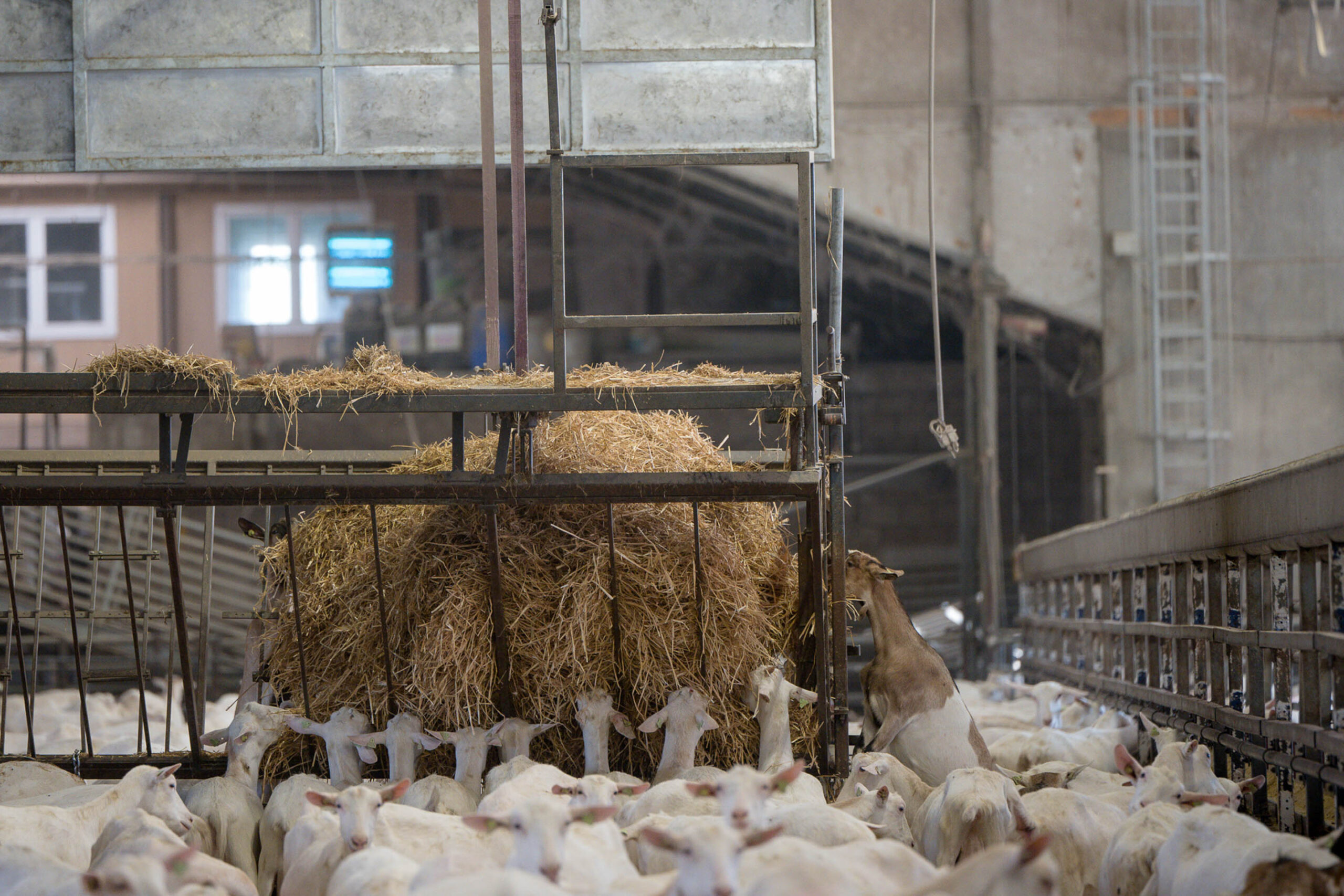 De stal aan de Bergenweg is uitgerust met een speciale carrousel waarin de geiten zowel gemolken als gevoerd worden. Twee machines rijden op en neer om de geiten te voorzien van vers en duurzaam geproduceerd mengvoer dat géén genetisch gemodificeerde grondstoffen bevat.