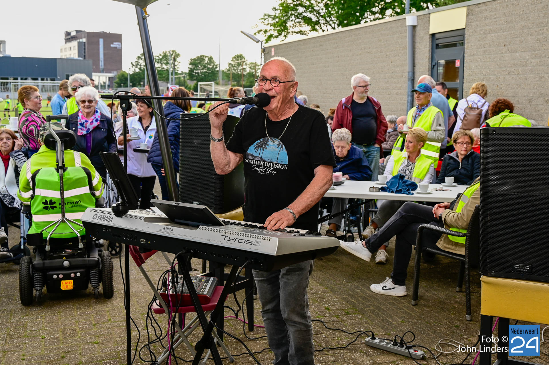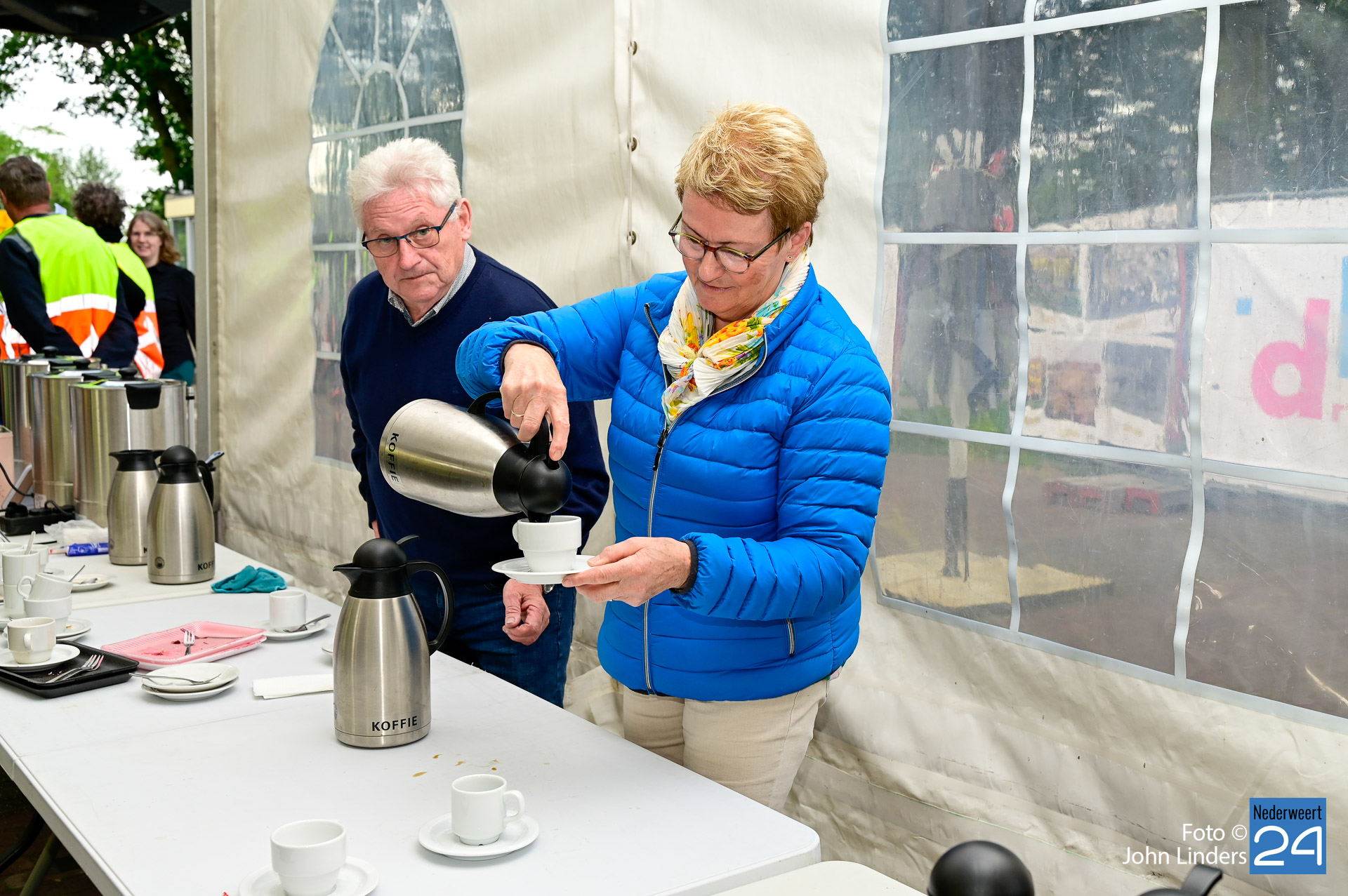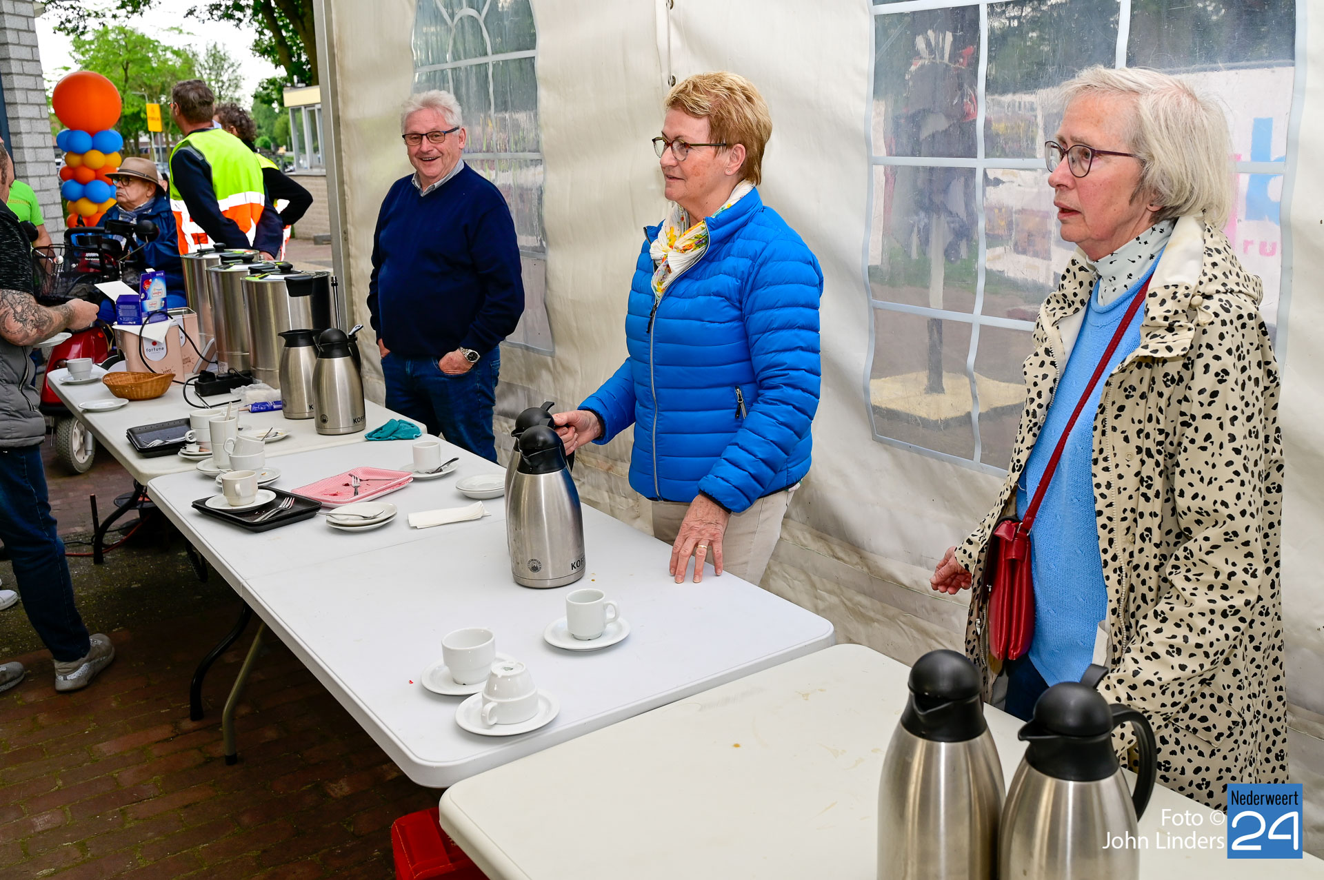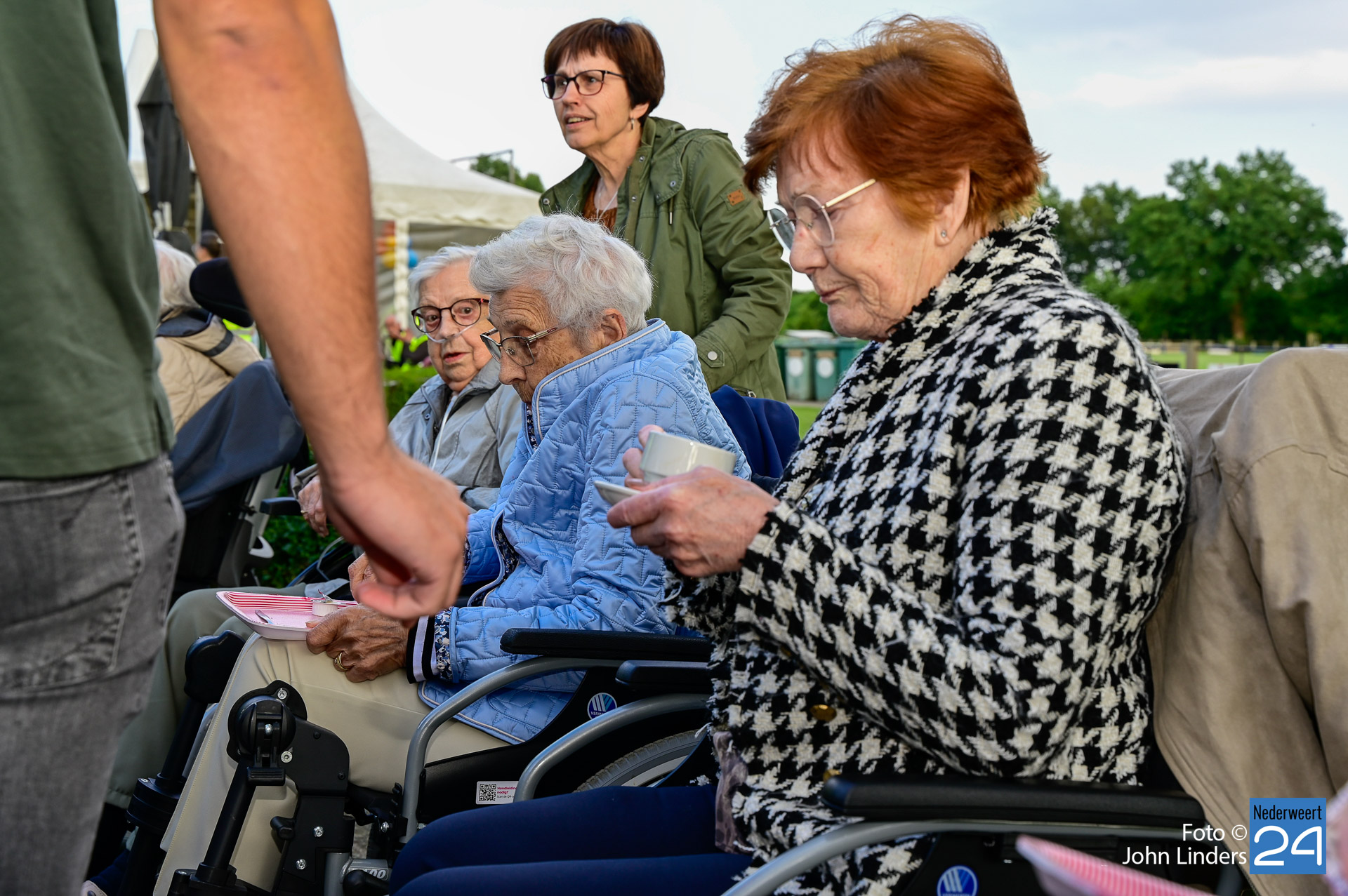 De pauzeplaats was dit jaar op het voetbalveld van Merefeldia. Hier stond een kopje koffie en een stukje vlaai klaar voor alle rolstoelers en hun begeleiders. Onder het genot van mooie muziek werd er volop genoten van de lekkernij en het samenzijn.
