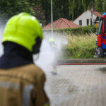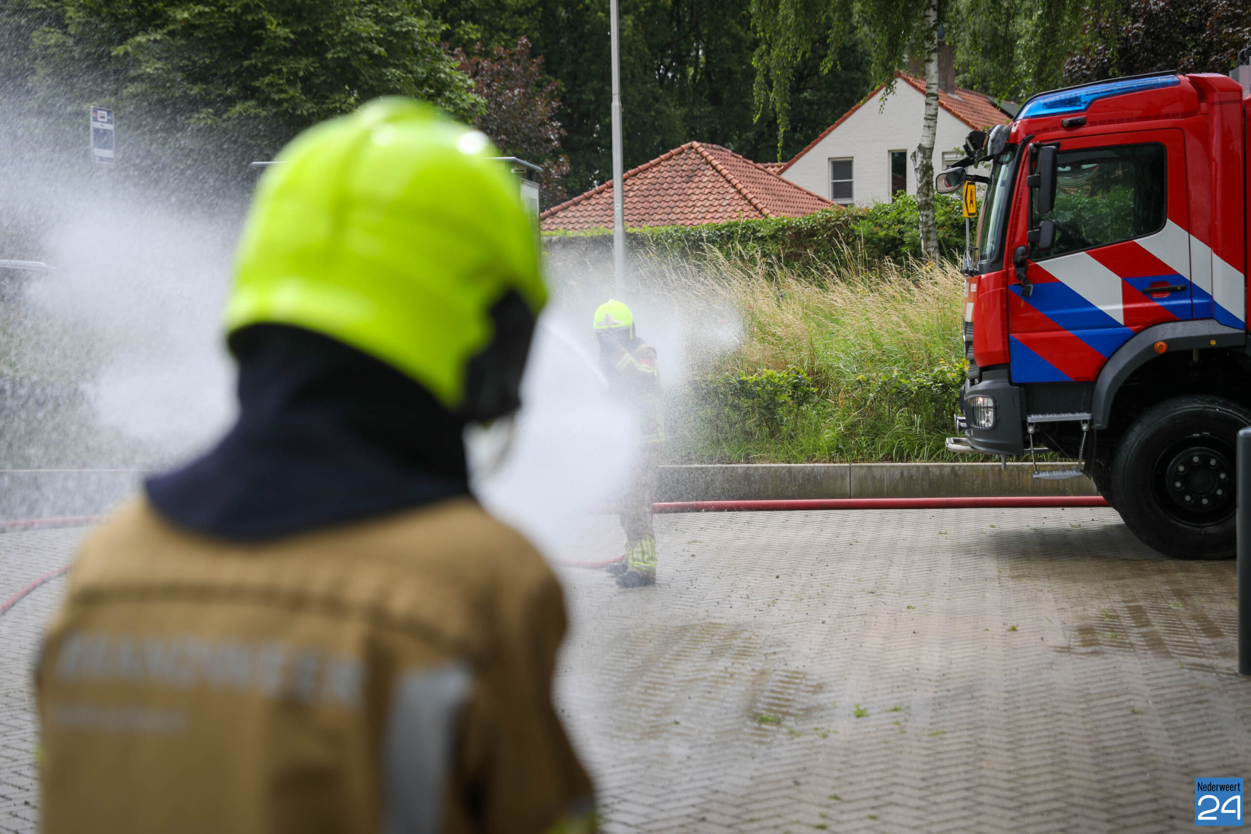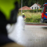 De bevelvoerder gaf het commando ‘Water’ en de straalpijpvoerders openen tegelijkertijd hun straal, gericht in een hoek van 60 graden t.o.v. de grond, naar elkaar toe.