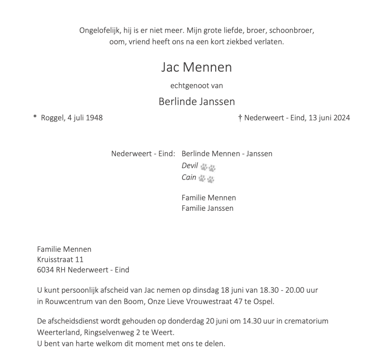 Overlijdensbericht | Jac Mennen †