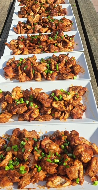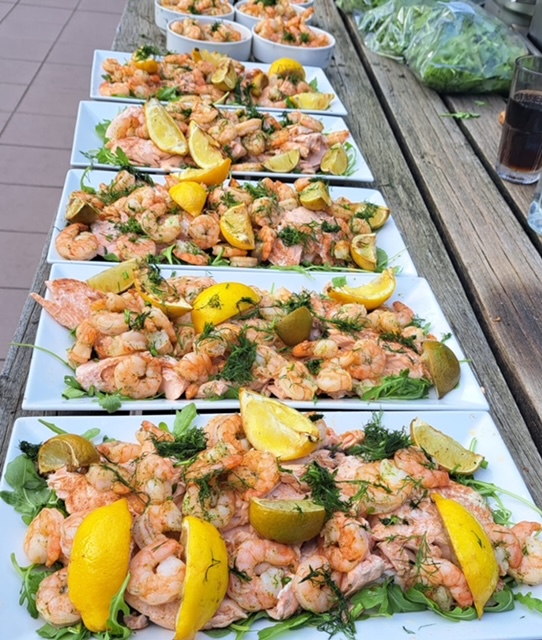 Het diner wordt geserveerd als sharing diner per tafel in 5 rondes. Dit zal bestaan uit truffelburgertjes, verse zalm met gamba’s, kippendijen, langzaam gegaard buikspek met bijpassende garnituren en als afsluiter een lavacakje met gegrilde ananas.