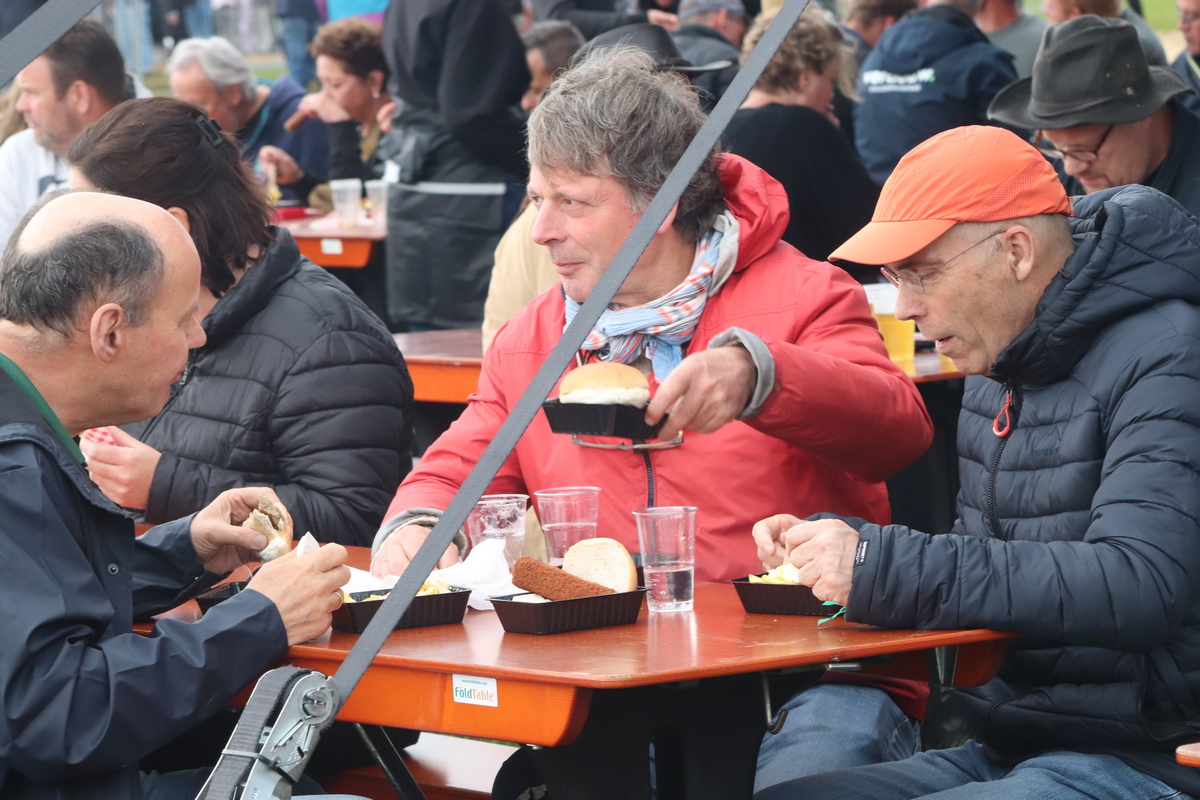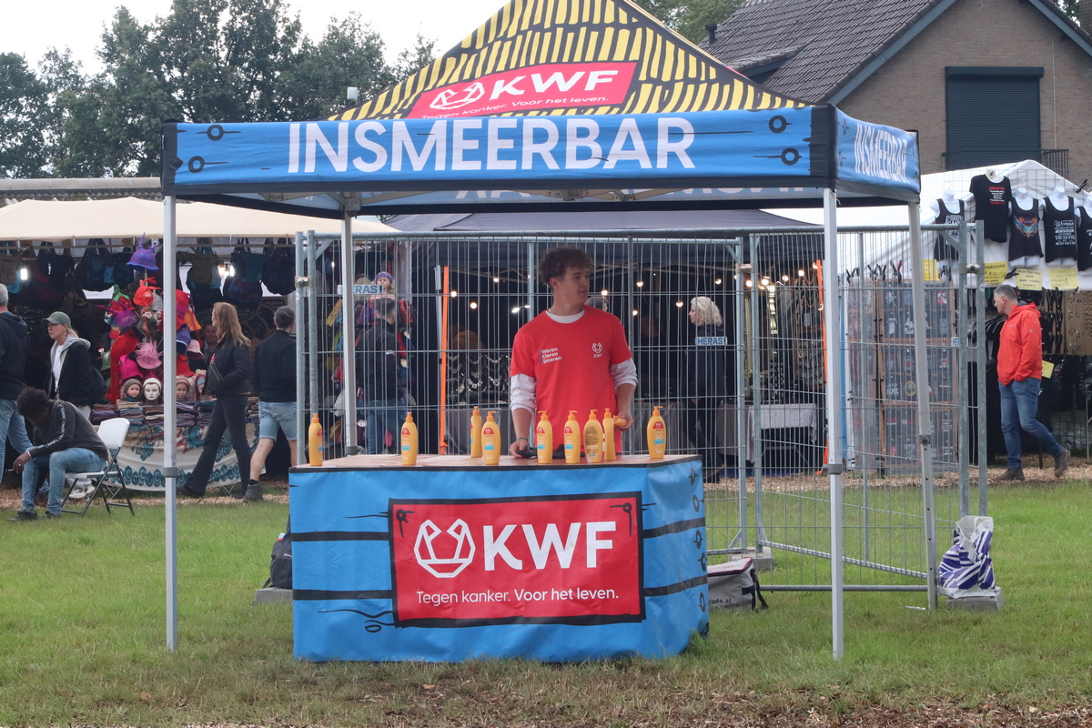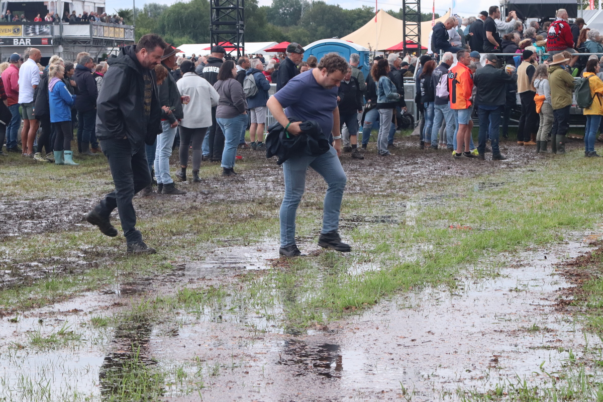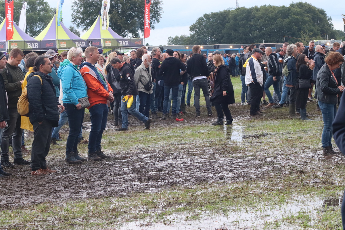 Dat had ook tot gevolg, dat het publiek zich verzamelde op het met rubber tegels bedekte voorterrein bij het podium en bij de vele bar-units, waar met houtschilfers de modder zoveel mogelijk werd beperkt. Waar normaal het publiek opeen gepakt kijkt en luistert naar de optredens, waren nu grote open plekken. En bij het groeien van het publiek werd de blubbermat alsmaar groter.