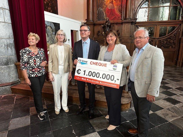 De heer Koppens overhandigde de cheque op maandag 15 juli aan burgemeester Op de Laak tijdens zijn afscheid als directeur van ETF Machinefabriek in Nederweert.