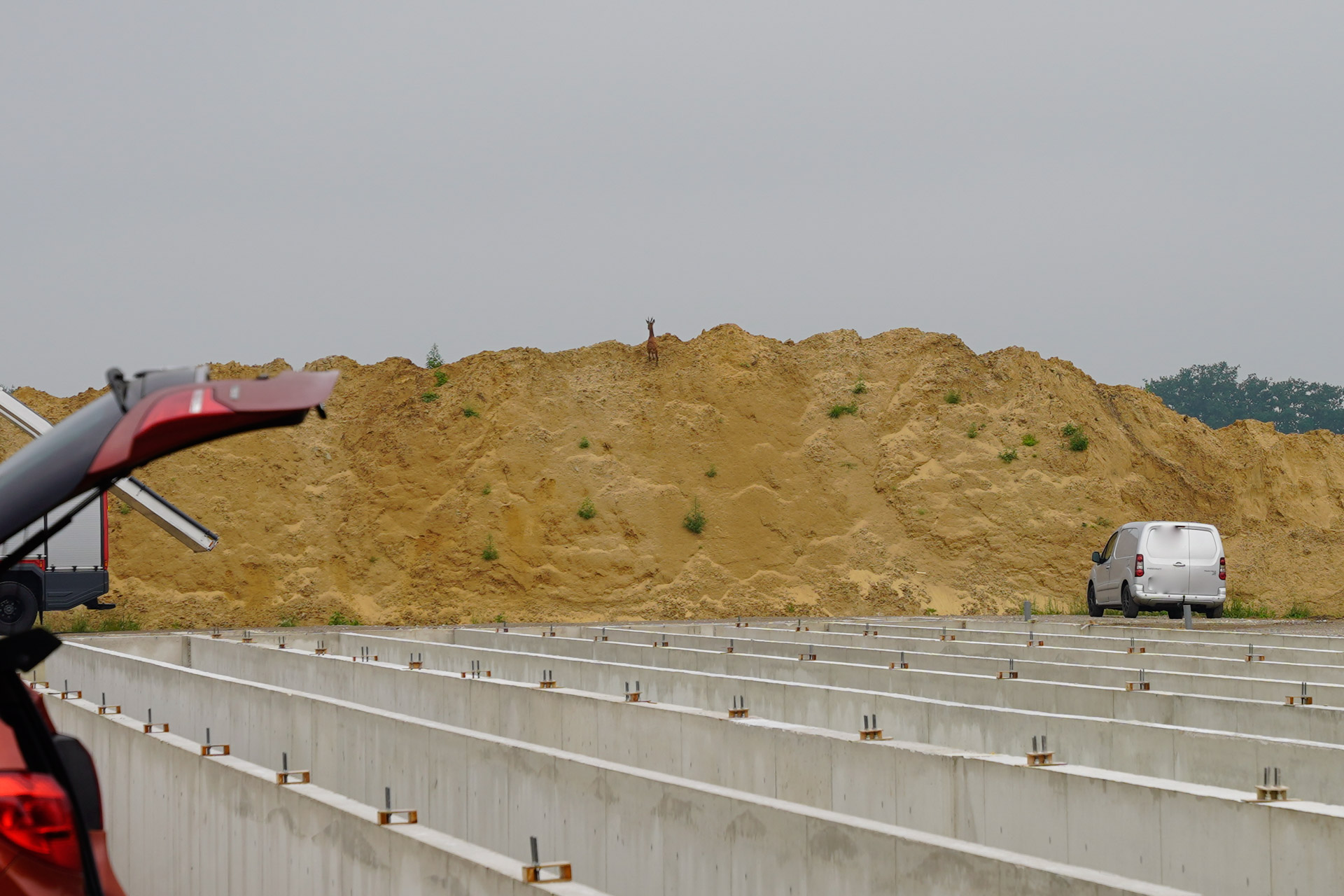 Het ree is vrijgelaten en rende via een grote berg zand de natuur in.