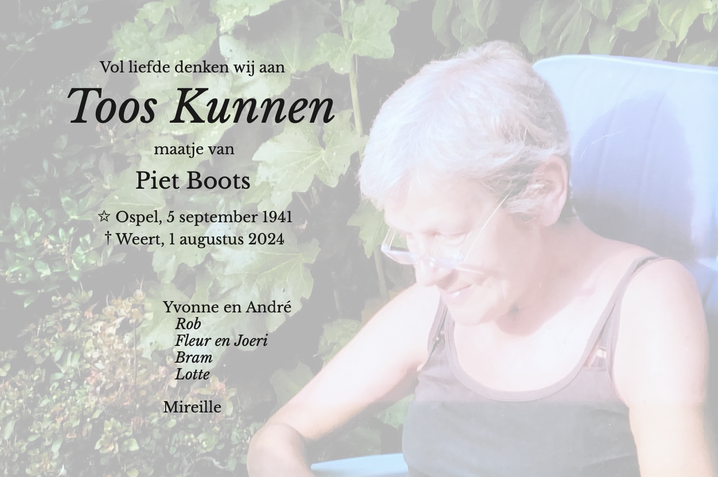 Ik ben bedroefd om het overlijden van Toos. Ik wens jullie allen veel sterkte bij het verwerken van dit verlies.