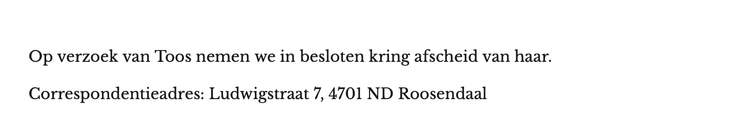 Sterkte met het overlijden van jullie moeder Toos. Ze blijft voor mij een hartelijke warme nicht.