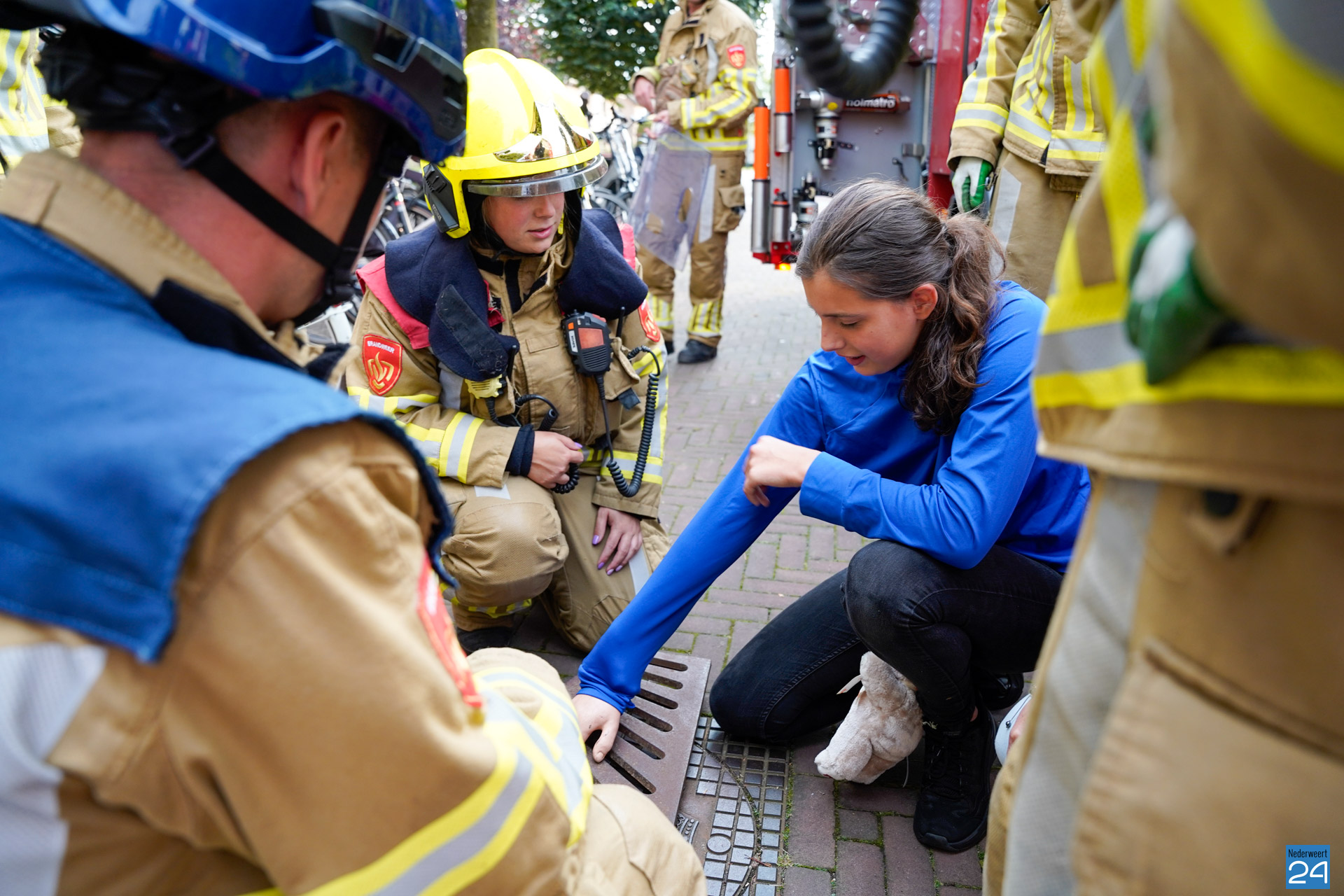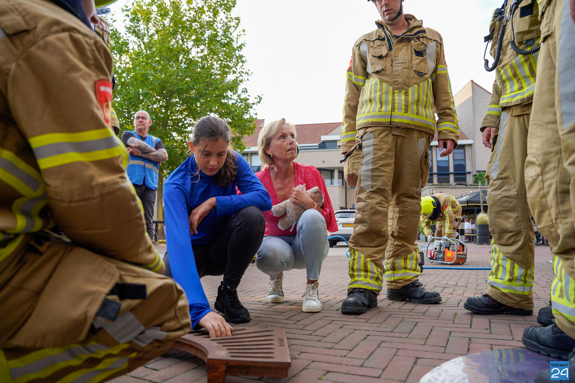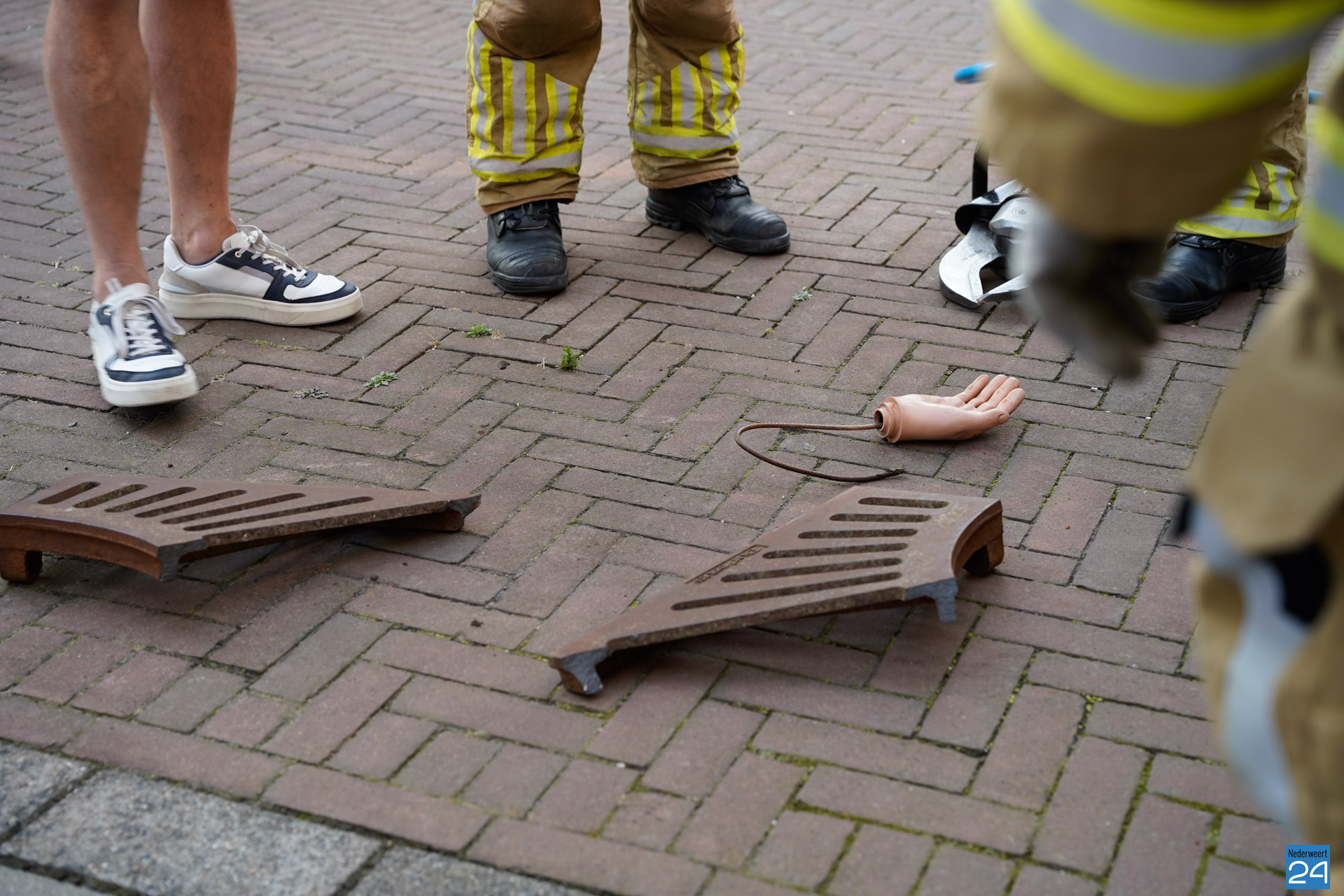 Met toeters en bellen kwamen drie brandweervoertuigen op het noodgeval af. De kastelein werd steeds meer geïrriteerd door het voorval en werd verzocht afstand te nemen. De overige aanwezige gasten konden onder het genot van een hapje en een drankje meekijken. De brandweer slaagde erin om de hand te bevrijden. Hierna mochten de vrijwilligers zelf het terras op. Verschillende partners hadden ondertussen al plaatsgenomen. In de vakantietijd oefent de brandweer van Nederweert gewoon door. De oefeningen worden dan vaak ‘met een knipoog’ uitgezet. Het ludieke scenario en het daaropvolgende schouwspel trok het nodige bekijks met zich mee.