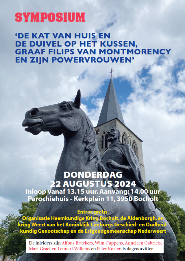Het is dit jaar 500 jaar geleden dat Filips van Montmorency, graaf van Horn en Heer van Weert, Nederweert en Bocholt, het levenslicht zag. Dat is de aanleiding voor een symposium op donderdag 22 augustus. Dat draagt de titel ‘De kat van huis en de duivel op het kussen, graaf Filips van Montmorency en zijn powervrouwen’. Niet te missen voor iedereen met een warm hart voor erfgoed, heemkunde en streekgeschiedenis. De Erfgoedgemeenschap Nederweert nodigt je uit!