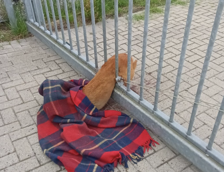 Vrijwilliger dierenambulance bevrijdt ree uit hekwerk in Nederweert