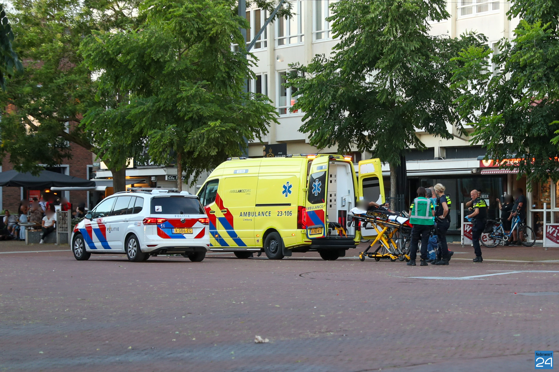Het ambulancepersoneel heeft een persoon, met handboeien om, in de ambulance geplaatst en meegenomen naar het ziekenhuis.