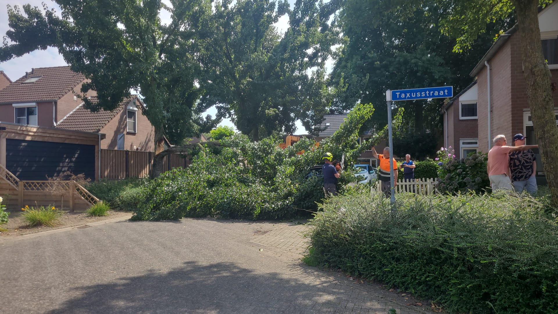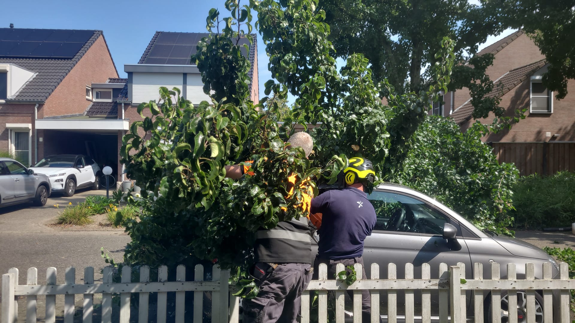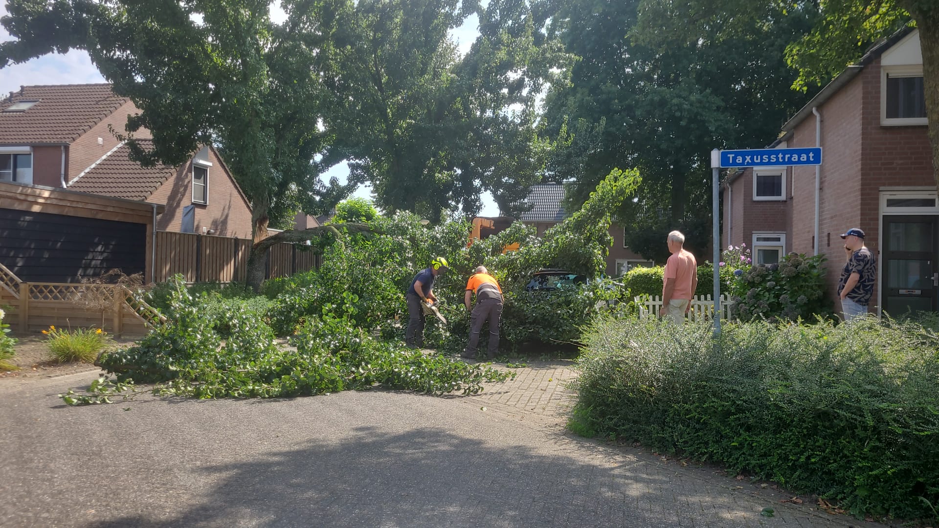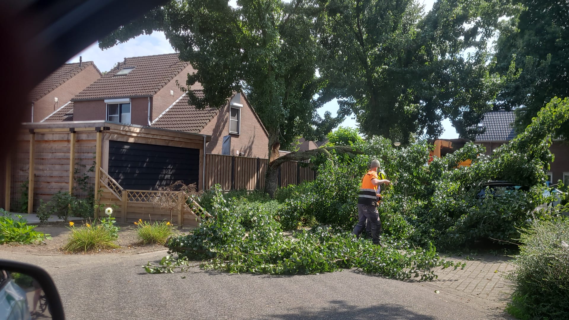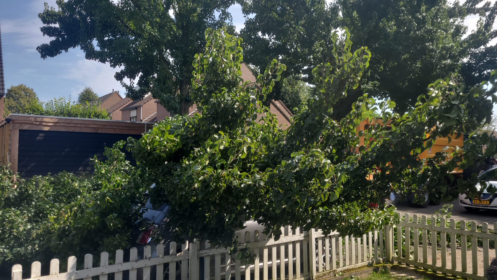 Donderdagmiddag is een boom omgewaaid en op een geparkeerde auto terechtgekomen in de Goudenregenstraat. De boom, vermoedelijk omver geblazen door een stevige windvlaag, veroorzaakte schade aan het voertuig.
