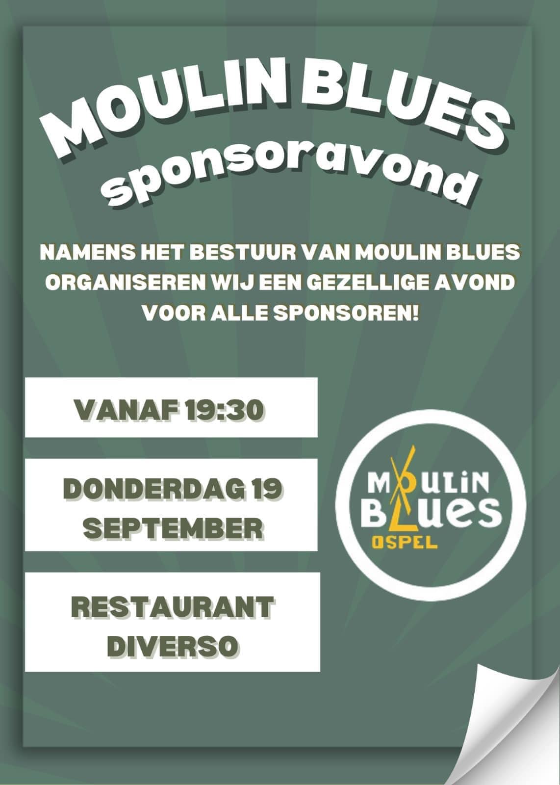 Het is belangrijk dat een goed contact onderhouden wordt met sponsoren. Daarom wordt op donderdag 19 september een gezellige sponsoravond georganiseerd voor alle sponsoren, maar ook voor potentiële sponsoren, met daarin meer weetjes over Moulin Blues en gezelligheid. Sponsoring kan op allerlei manieren. Dit kan met geld, diensten, mankracht, reclame, materialen, noem maar op. Uiteraard staan daar ook weer veel leuke dingen tegenover.