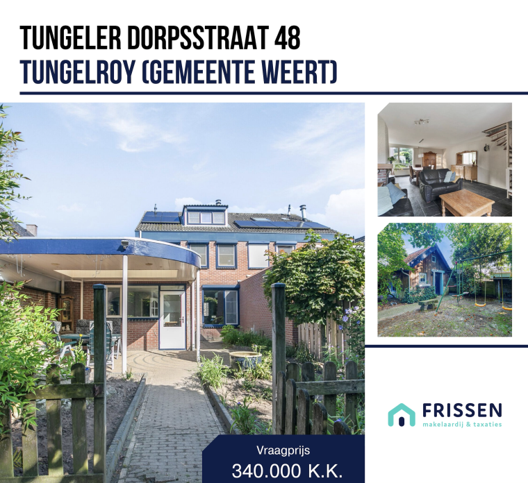 Te koop uitgebouwde, 2-onder-1-kapwoning met inpandige garage, rustig gelegen op een royaal perceel van ruim 500 m2, in de dorpskern van Tungelroy