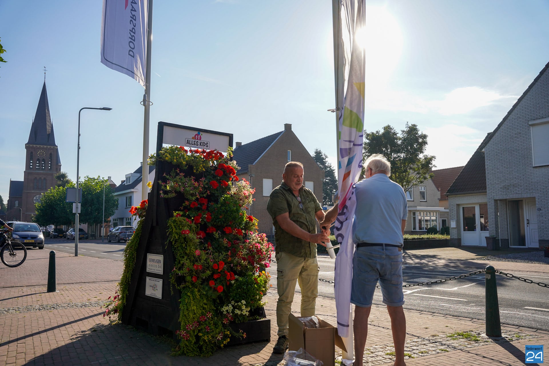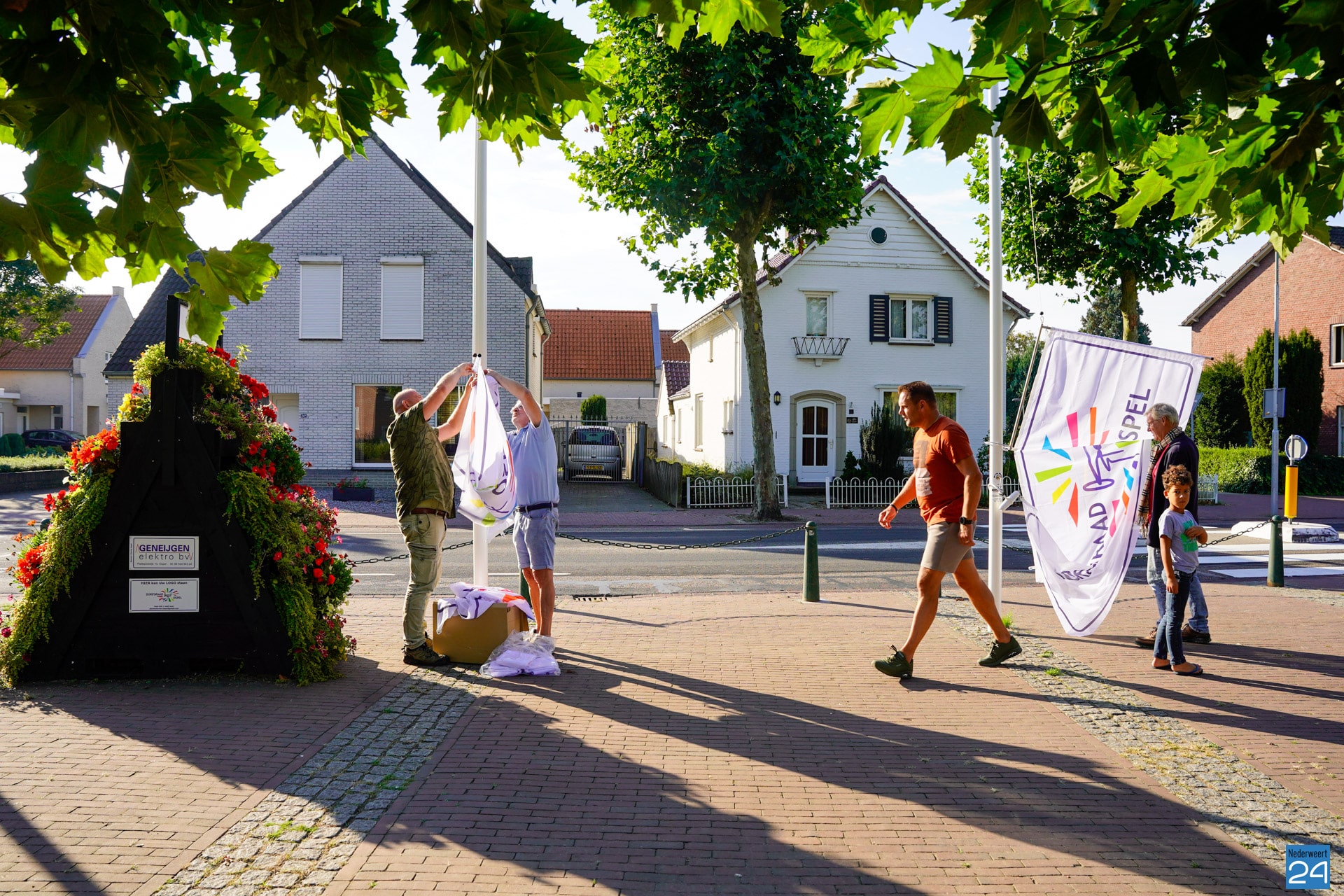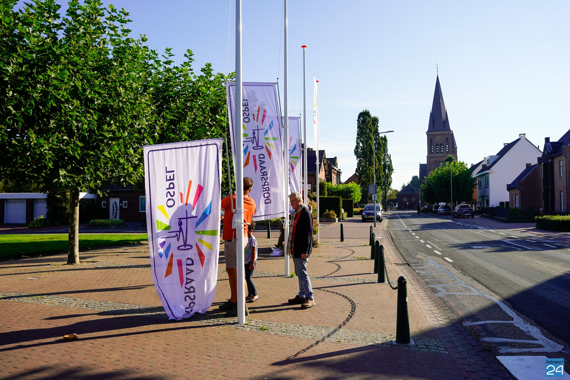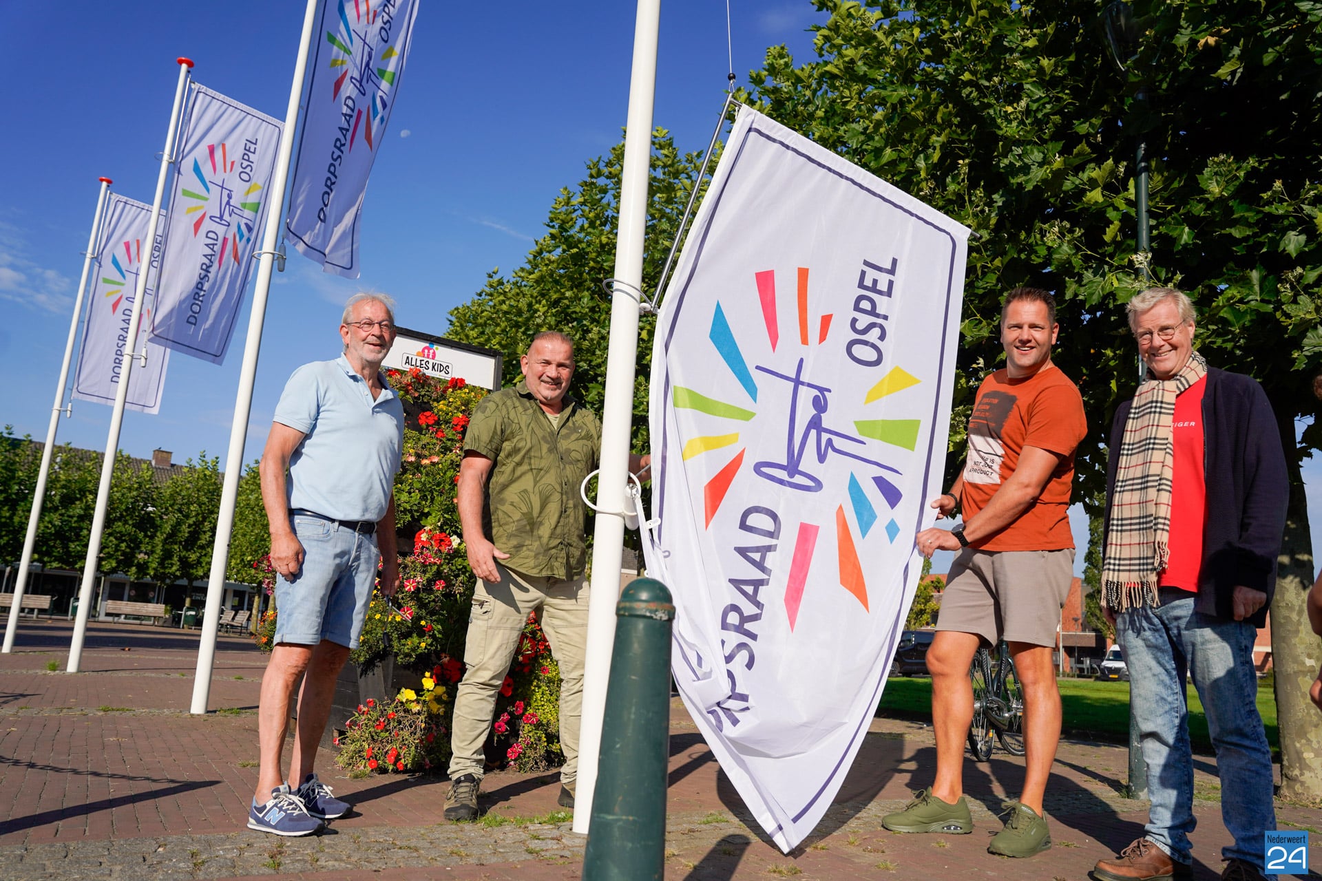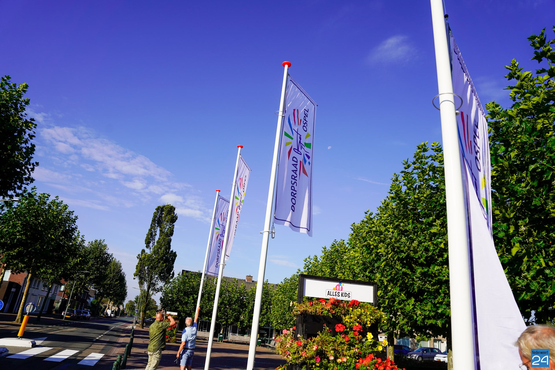 De Dorpsraad Ospel beheerd deze masten en vandaag zijn dan ook de nieuwe dorpsraad banniers voor het eerst gehesen. Een mooi vernieuwend aangezicht van het Aerthijsplein. Één van de diverse verfraaiingen van het dorpsplein voor de komende tijd.