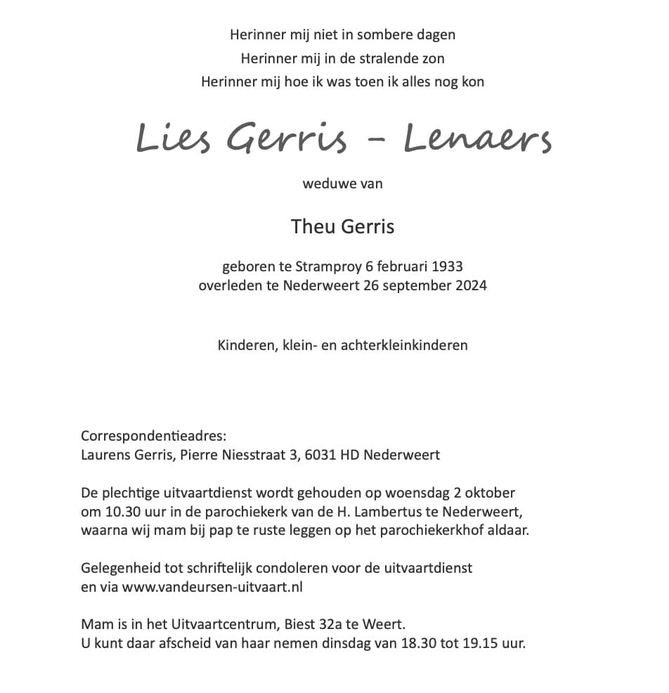 Overlijdensbericht | Lies Gerris – Lenaers †