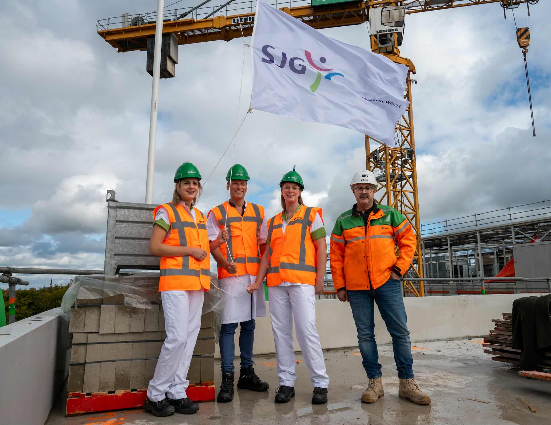 De nieuwbouw van SJG Weert bereikte donderdag 10 oktober een belangrijke mijlpaal: het hoogste punt werd behaald. Volgens traditie werd dit moment samen met de bouwers gevierd. Drie zorgmedewerkers hadden de eer om als eersten naar de top van het gebouw te klimmen en een SJG-vlag te hijsen.