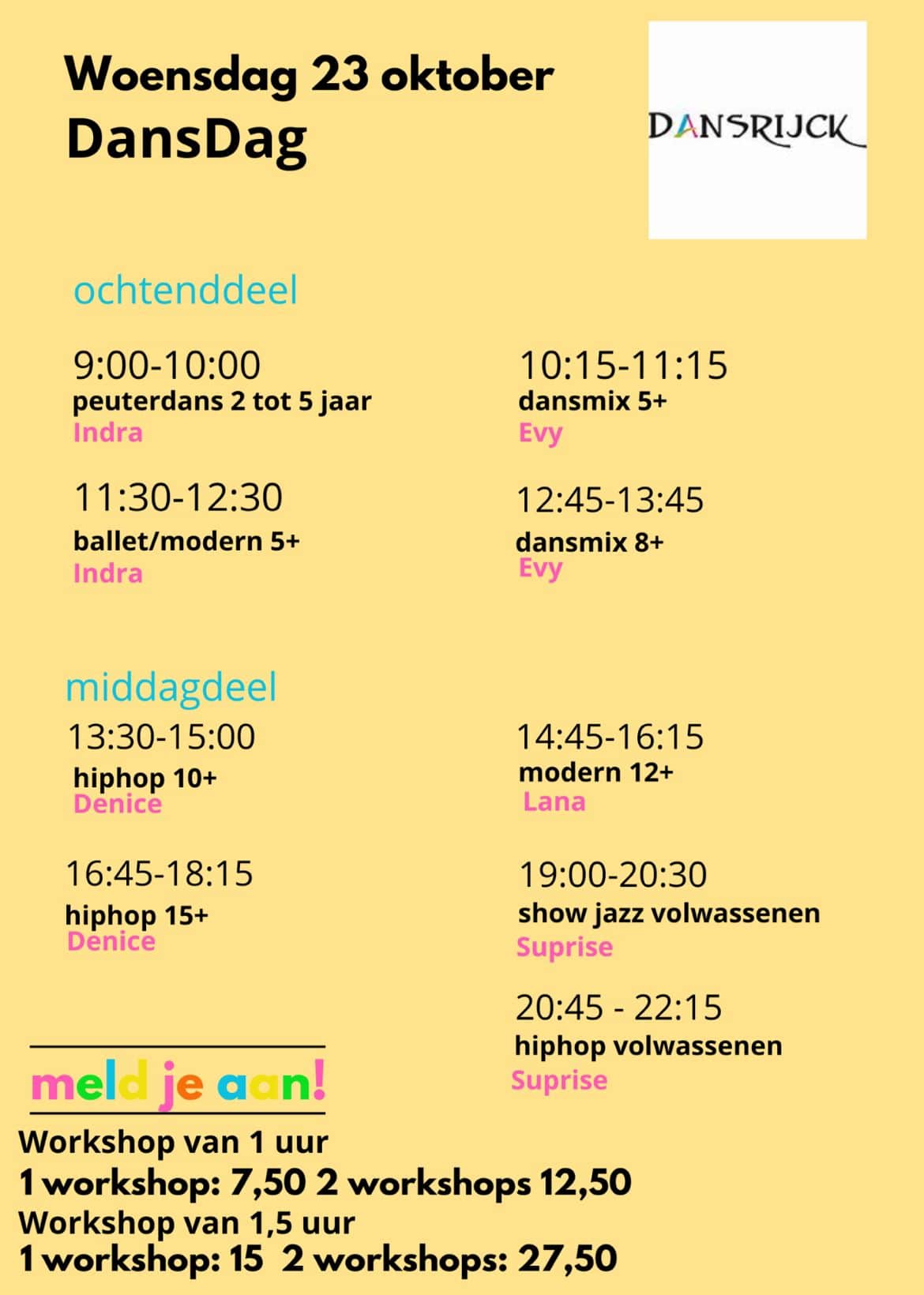 Heb je zin in een een leuke dag? Gaat je dansles niet door in de herfstvakantie? Nooit eerder gedanst, of al ervaring met dansen Kom op 23 oktober naar een of meer workshops bij Dansrijck.