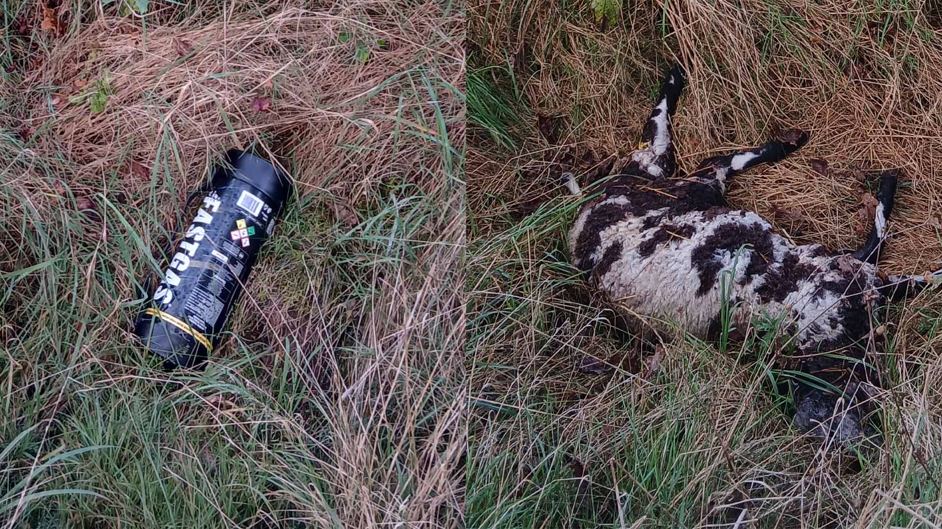 Het moet niet gekker worden. In de berm van de 1e Schoorbaan: een lachgascontainer, en 100 meter verder een dood schaap. Lachen, of niet?