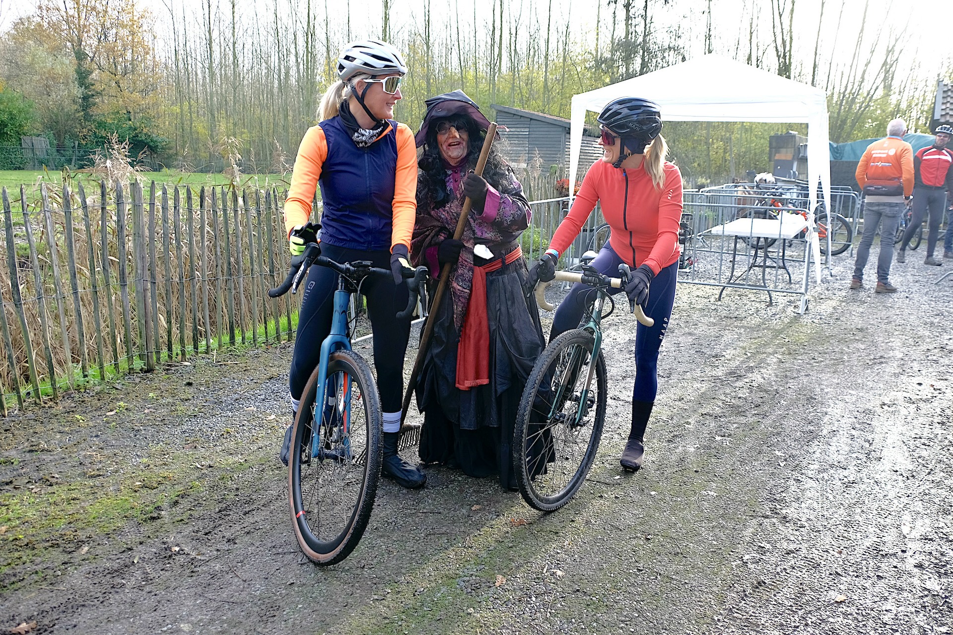 In alle vroegte jaagt heks Aldje Hendrikx de startende fietsers in het donker de stuipen op het lijf. Ze zwaait met haar bezem en rent achter de nietsvermoedende deelnemers aan. “Goedemorgen, ben je al wakker? Zo jij hebt mooi geschoren benen”, zegt ze wijzend naar de lange fietsbroek. Ze houdt van een dolletje, improviseert ter plekke en heeft op alles een gevat antwoord. “Ik vind het heerlijk om in de rol van een ander te kruipen. Dan kan je lekker gek doen en mensen blij maken.” Naast de dollende heks is de nieuwe startlocatie café zaal Le Winne aan Boeket 6 in Nederweert, omgetoverd tot een gezellige heksenkeet.