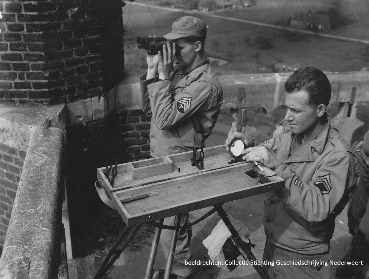 Amerikaanse militairen op de zwaarbeschadigde St. Lambertustoren bekijken de Duitse krijgsverrichtingen aan de overzijde van het kanaal. Foto collectie SGN.