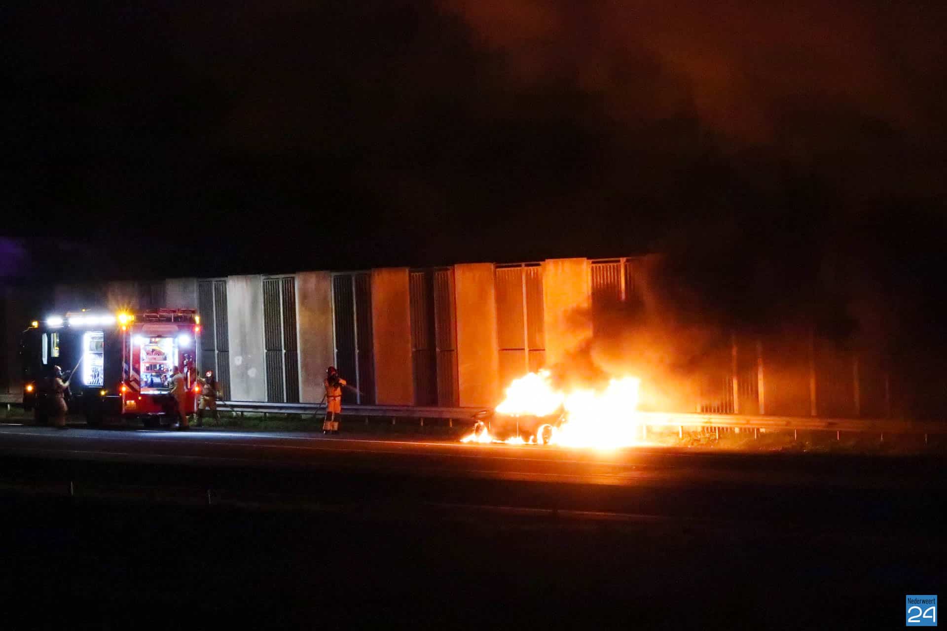 Een auto is in de nacht van zondag op maandag volledig uitgebrand op de snelweg A2 in Weert, vlak voor de afrit Nederweert.