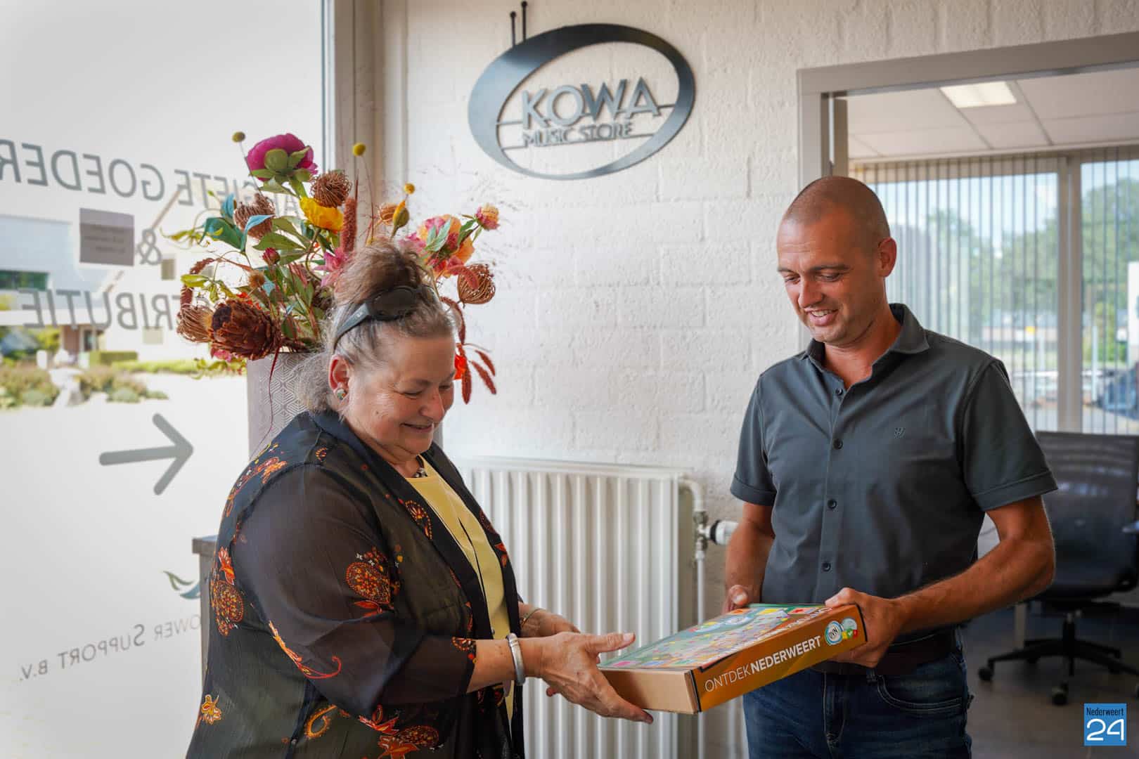 Kowa Music Store en Full Power Support zijn een van de nieuwe leden van de Ondernemers Vereniging Nederweert (OVN). Speciaal voor deze gelegenheid overhandigde Marleen Linsen namens de OVN een welkomstgeschenk in de vorm van het bordspel ‘Ontdek Nederweert’. Ook stelde de OVN Nick Waltmans van Kowa Music Store en Full Power Support een aantal vragen.