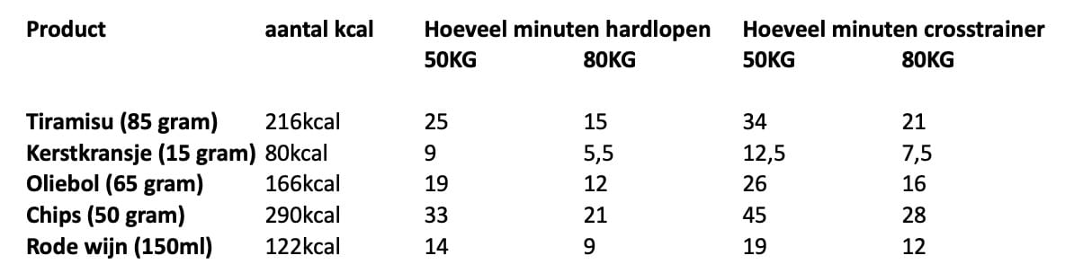 Om een kleine inkijk te geven in hoeveel calorieën specifieke kerstproducten bevatten heb ik hieronder een klein overzicht gemaakt. Inclusief de tijd die je erover doet om het er weer af te trainen. Wie weet denk je er nog een keer over na voor je nóg een kerstkransje in je mond stopt.