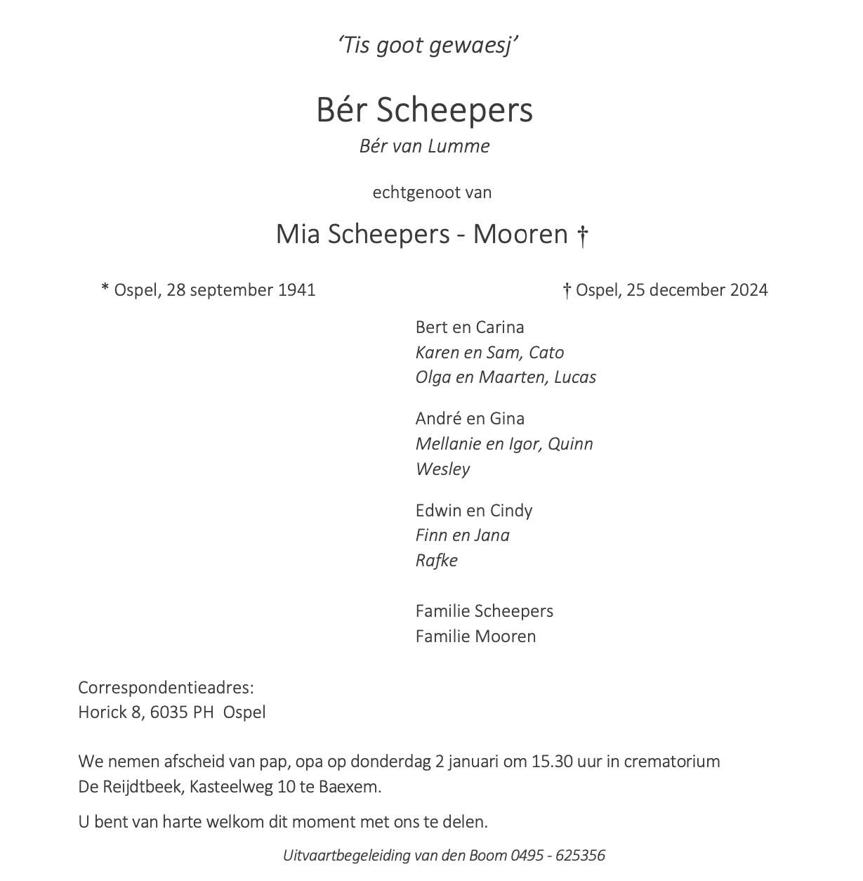 Familie Scheepers gecondoleerd we wensen jullie alle heel veel sterkte toe, Wiel en Gemmie van Gemert-Meevis.