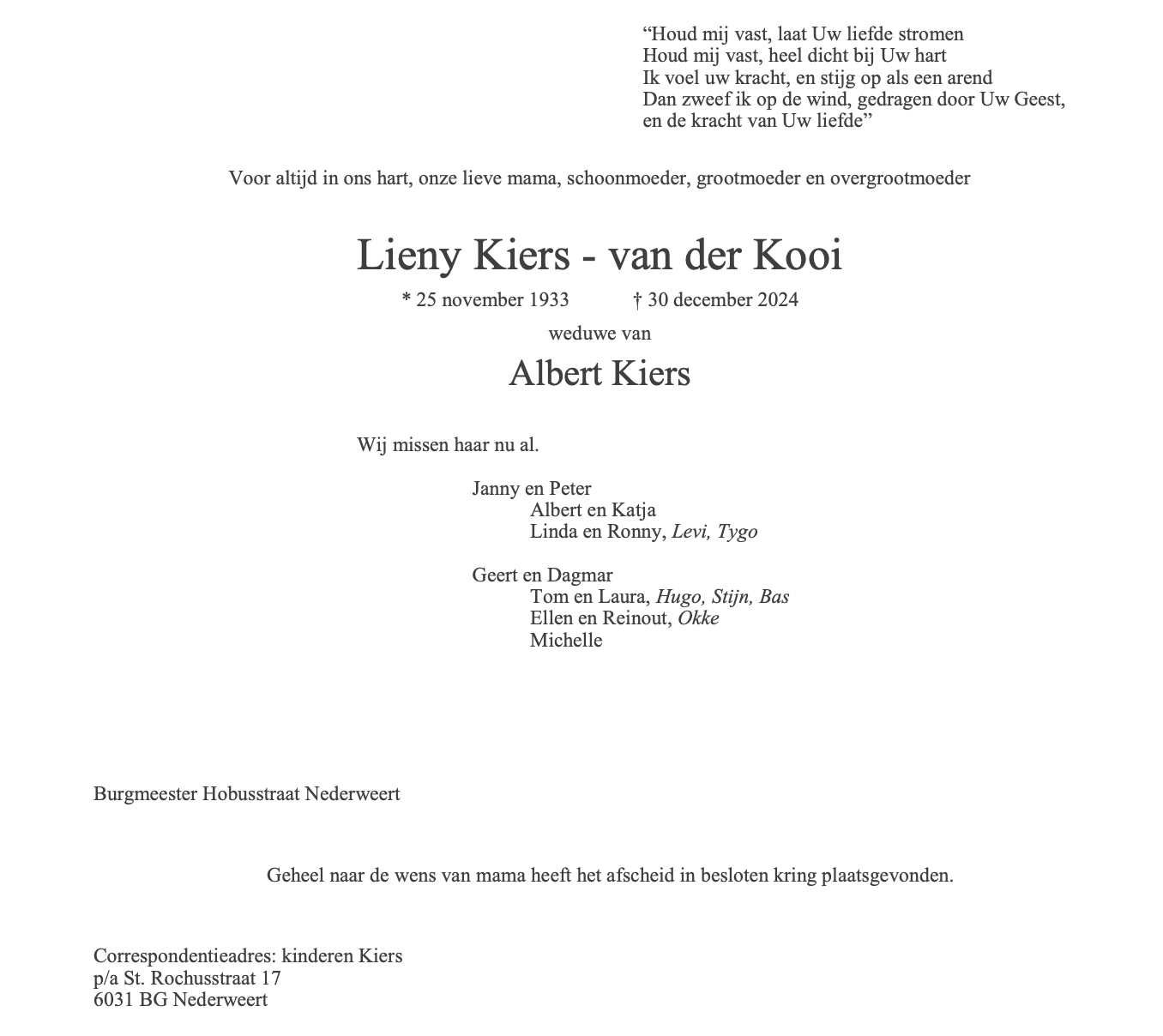 Overlijdensbericht | Lieny Kiers – van der Kooi †