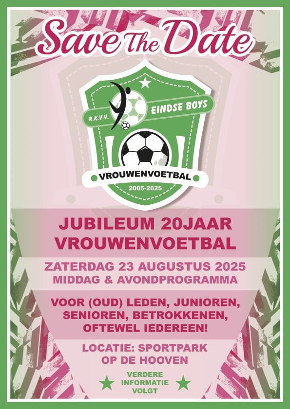 Op zaterdag 23 augustus viert Eindse Boys het 20 jarig bestaan van het vrouwenvoetbal binnen de vereniging. Tijdens de nieuwjaarsreceptie op 3 januari presenteerde de jubileumcommissie het speciaal hiervoor ontworpen logo en de “SAFE THE DATE” flyer.