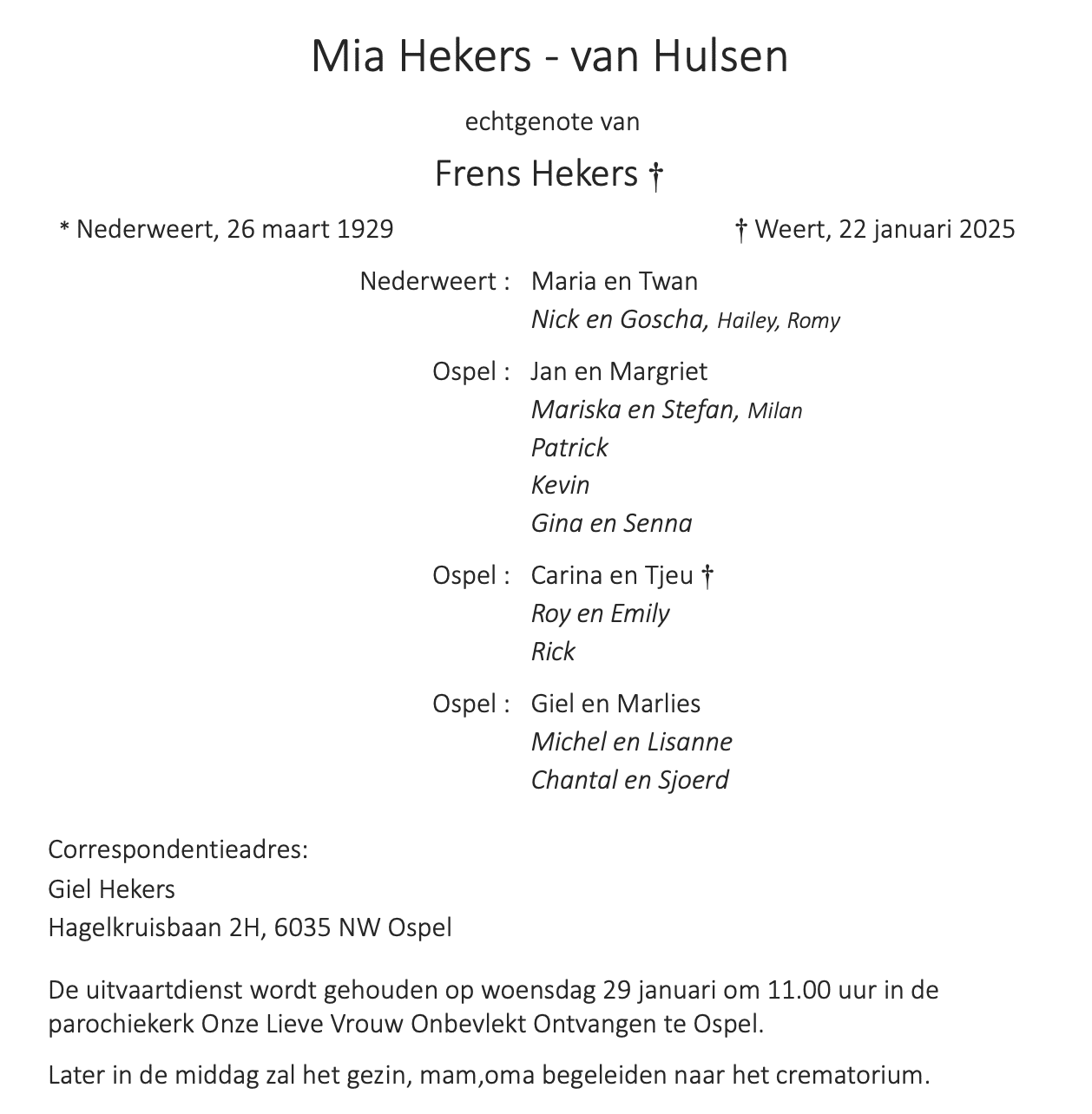 Overlijdensbericht | Mia Hekers – van Hulsen †