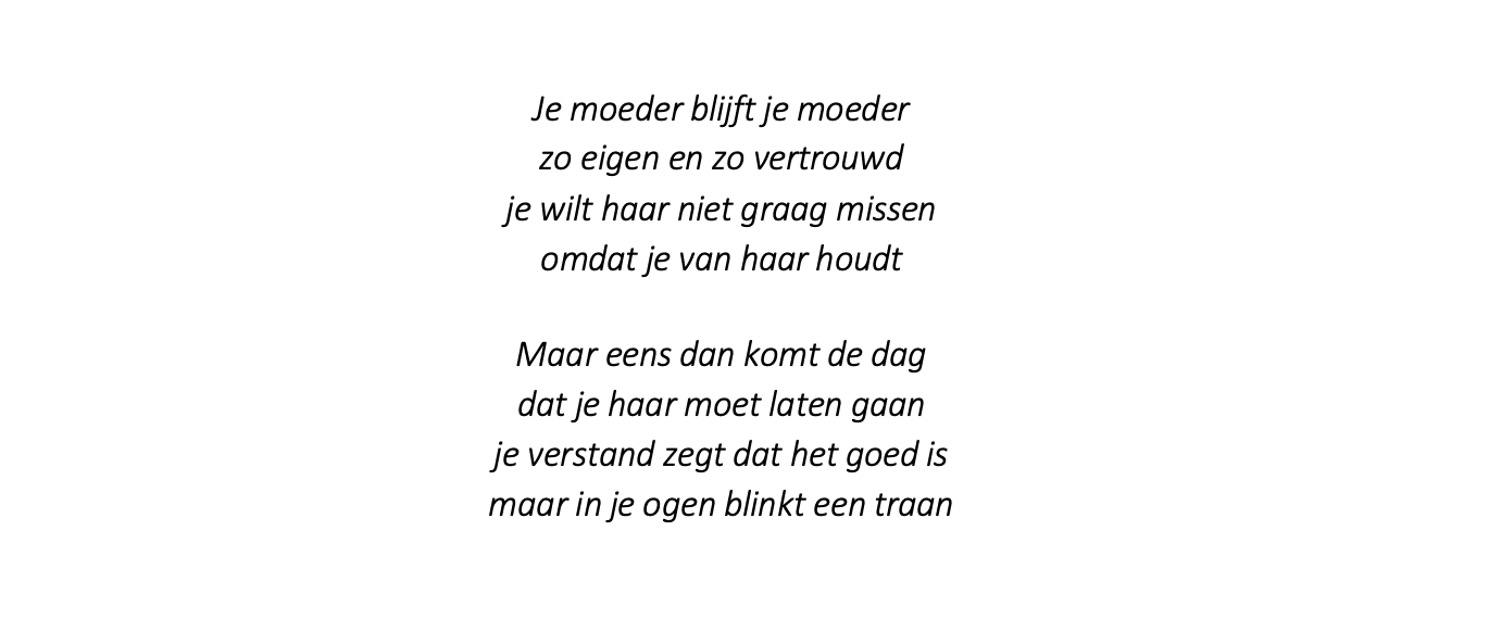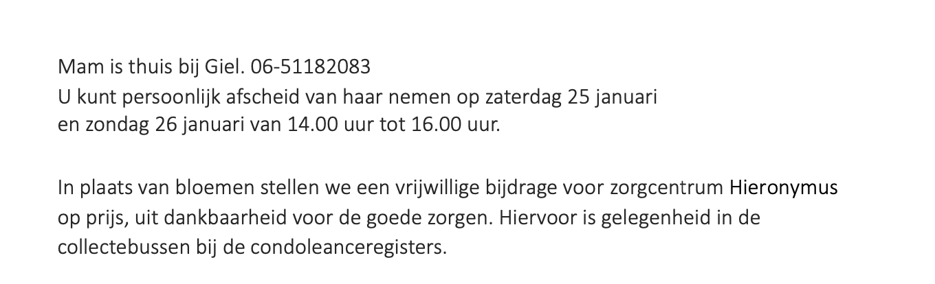 Allereerst gecondoleerd. Verdrietig, ook al heeft ze een prachtige leeftijd. Ik realiseerde me niet dat ze net zo oud was als ons pap. We wensen jullie heel veel sterkte.