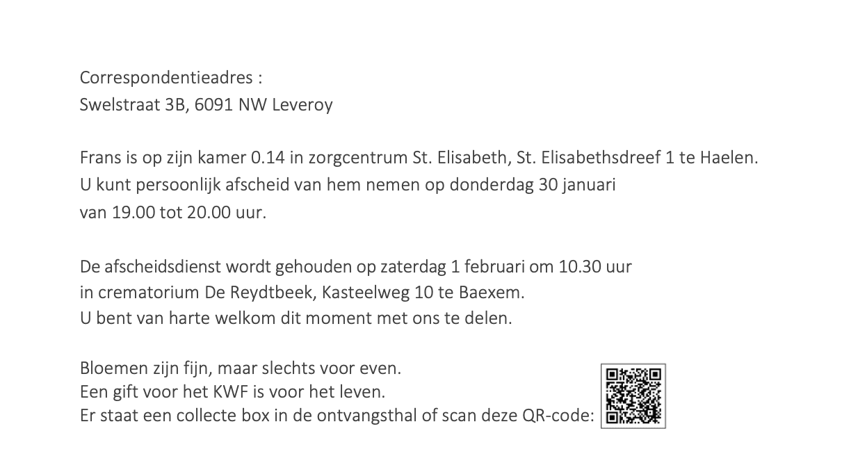 Beste Familie,gecondoleerd met het verlies van Frans,