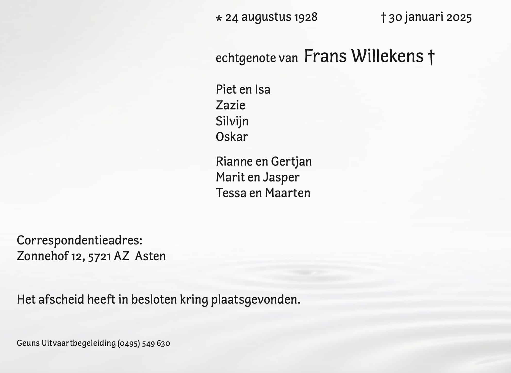 Gecondoleerd familie Willekens Jonkers en heel veel kracht en sterkte toegewenst