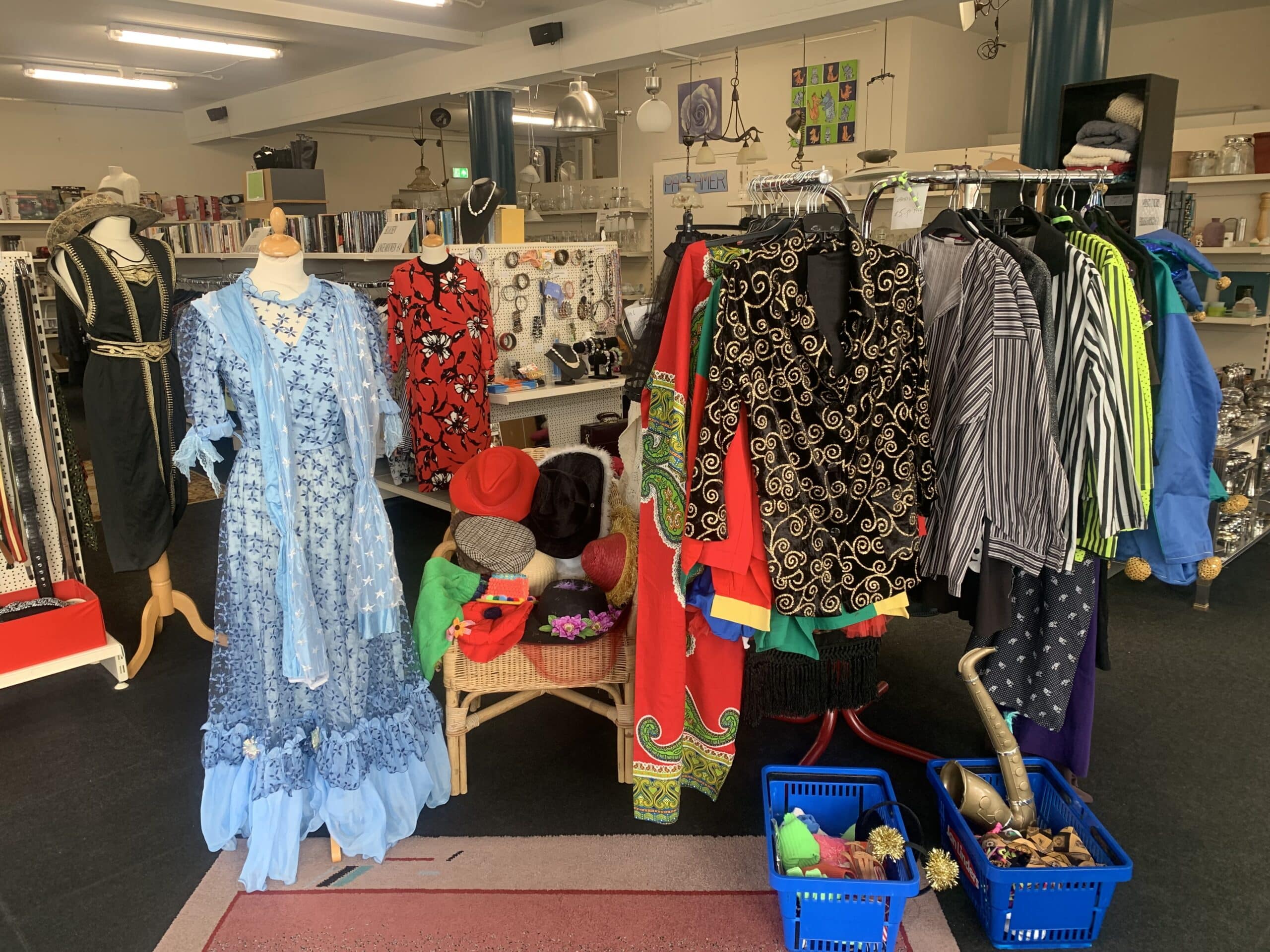 In de winkel is op dit moment veel carnavalskleding te vinden vanaf €2,50. Er is ruime keuze uit o.a. pakjes, kielen en feestjurken. Ook hoeden en petten zijn in de aanbieding.