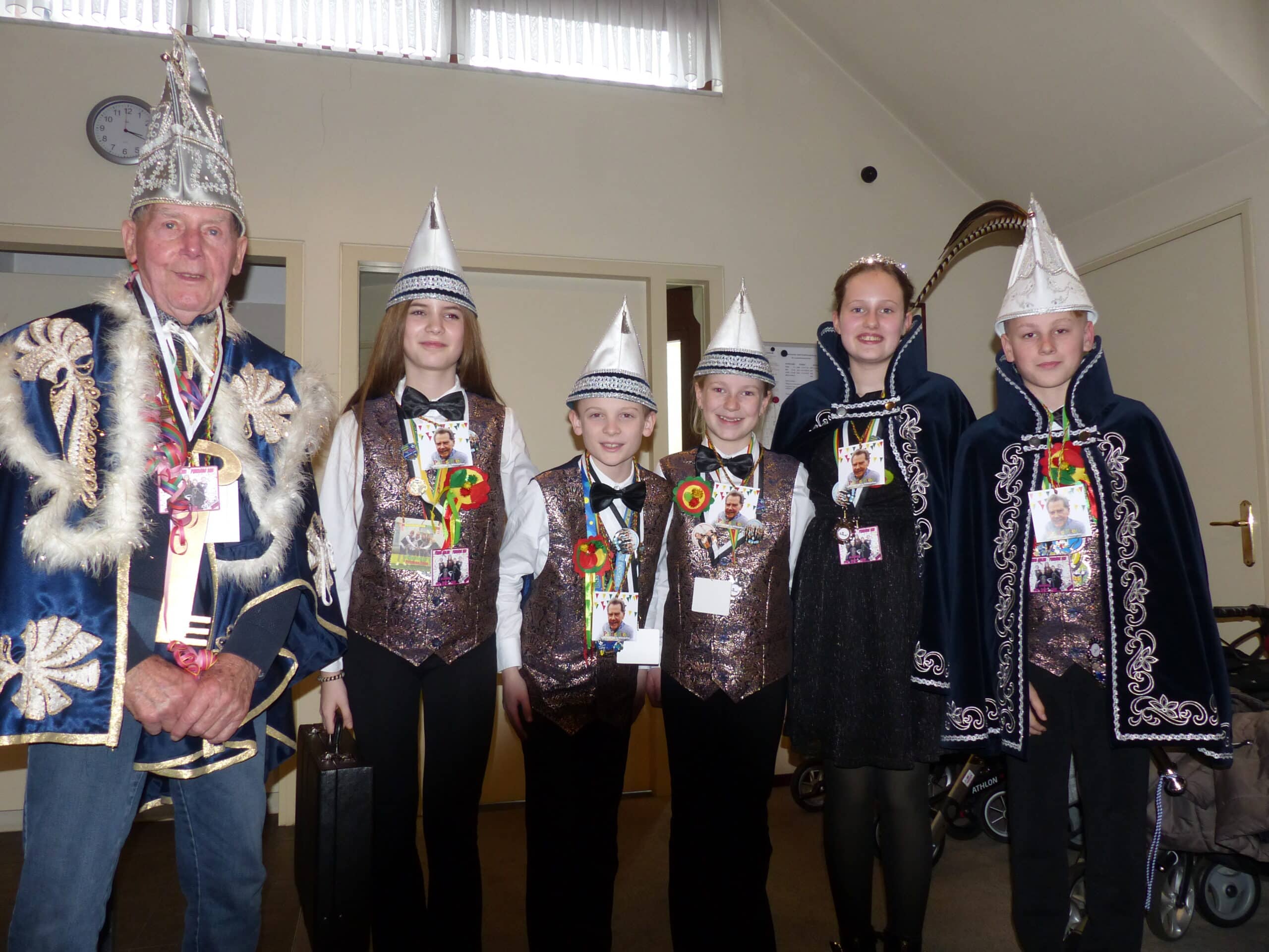 Het was een complete verrassing voor Piet en hij was zichtbaar onder de indruk. Er werd een uitgebreide proclamatie voorgedragen en zijn dochter en zoon met wederhelft verrasten hem met een bezoek. Ook werd hem de sleutel van de Huiskamer overhandigd. Piet reikte persoonlijk zijn onderscheiding (de orde van de Wienderkes) uit aan alle aanwezigen. De vrijwilligsters hadden goed voor iedereen gezorgd met echte Truujesoep, een soep die traditioneel met Vasteloavendj in Limburg wordt gegeten. Ook waren er lekkere nonnevotten. De Huiskamer en zijn Prins kregen ook nog bezoek van Prins Milan en Prinses Isa van IKC de Kerneel. Met een polonaise werd het bezoek van de jeugdprins en jeugdprinses afgesloten. Aan de foto’s is te zien dat het een gezellige middag is geweest.