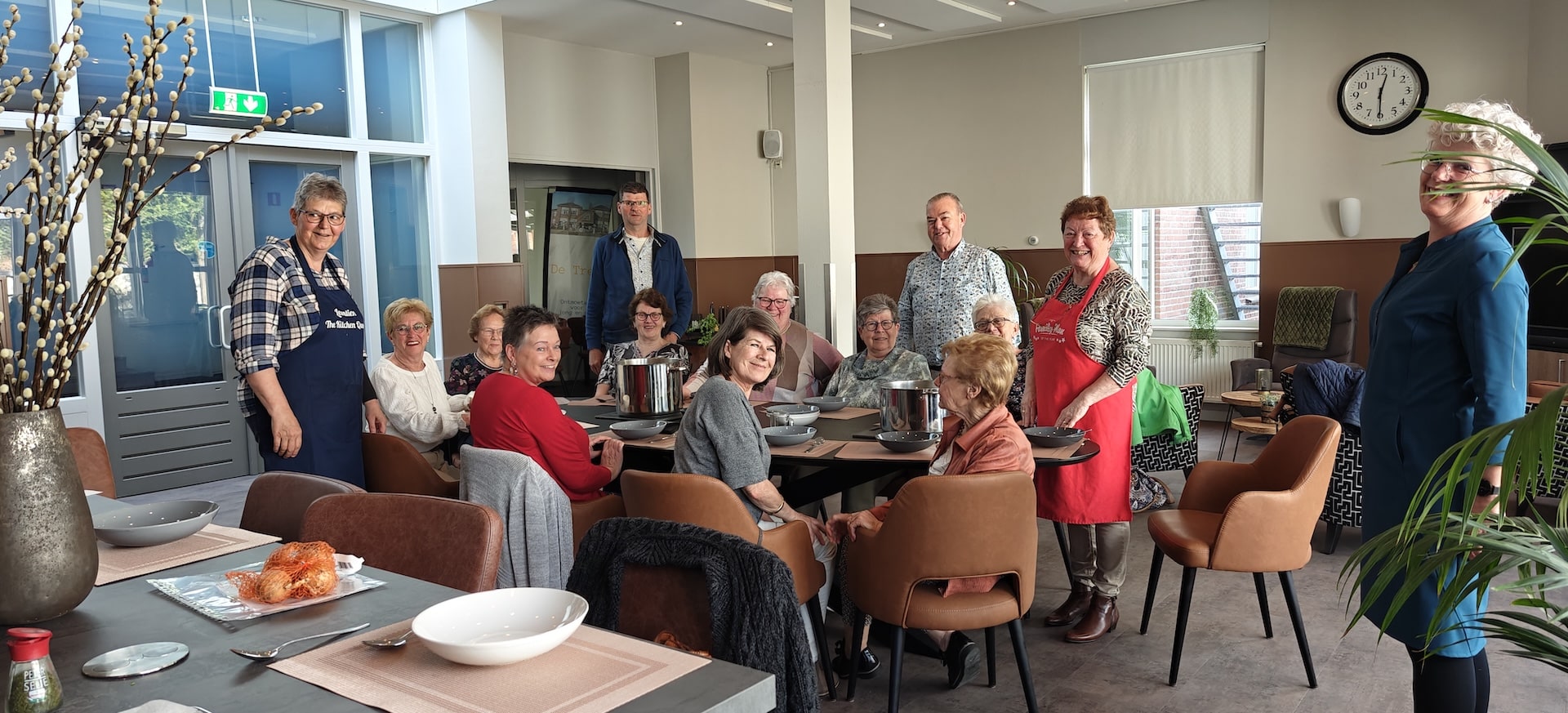 Met een enthousiaste groep deelnemers werd na een kopje koffie of thee en een koekje vol energie begonnen aan het schillen en snijden van de ingrediënten. Alles werd zorgvuldig in de soeppannen gedaan, waarna de bouillon werd toegevoegd en de soepen op de inductiekookplaat tot een smaakvol geheel werden gekookt.