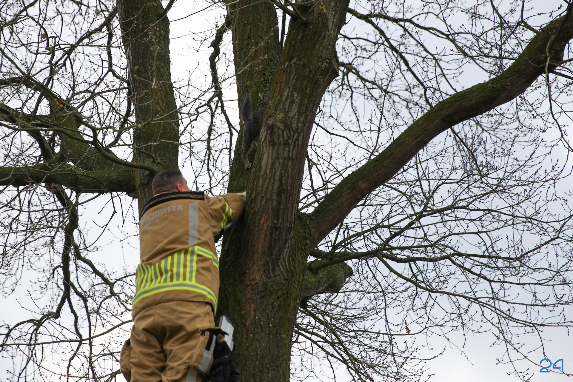 Het dier zat al enkele dagen in de boom, tot een buurtbewoner besloot de brandweer te waarschuwen. Hij had zelf al tevergeefs geprobeerd de kat met een ladder te bereiken, maar telkens kroop het dier hoger de boom in zodra hij in de buurt kwam.