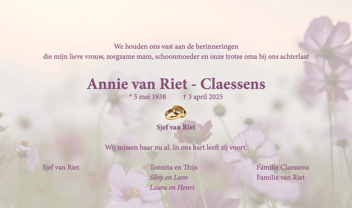 Gecondoleerd met het overlijden van Annie veel sterkte voor nu en in de toekomst.