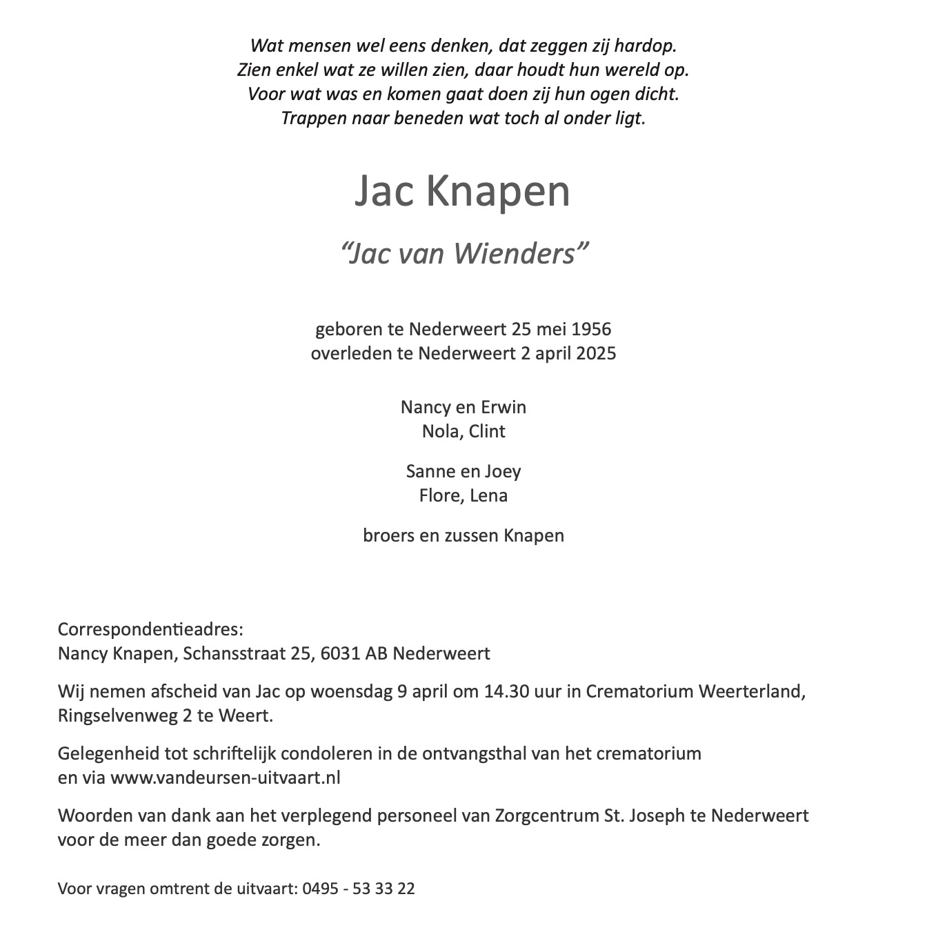 Overlijdensbericht | Jac Knapen