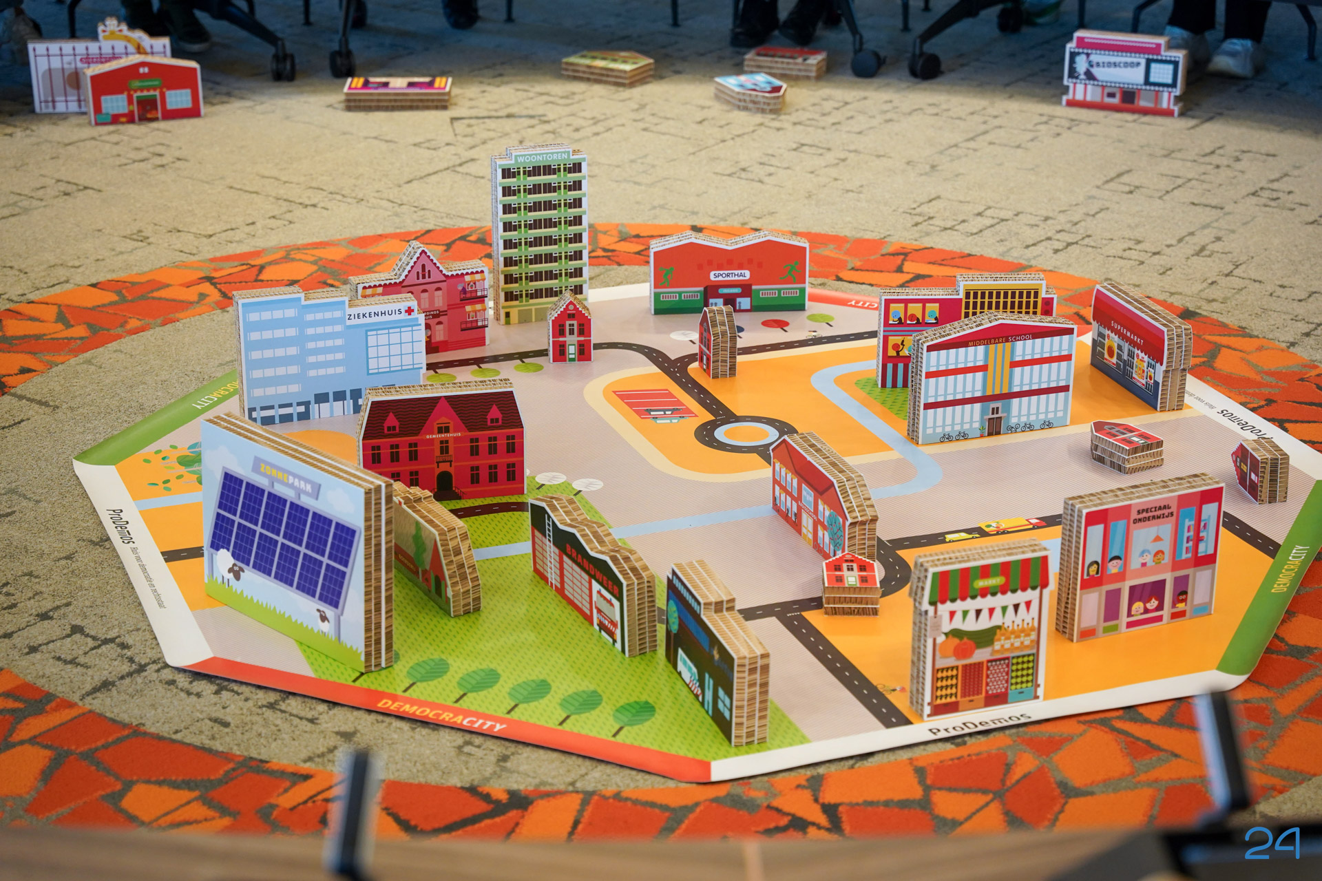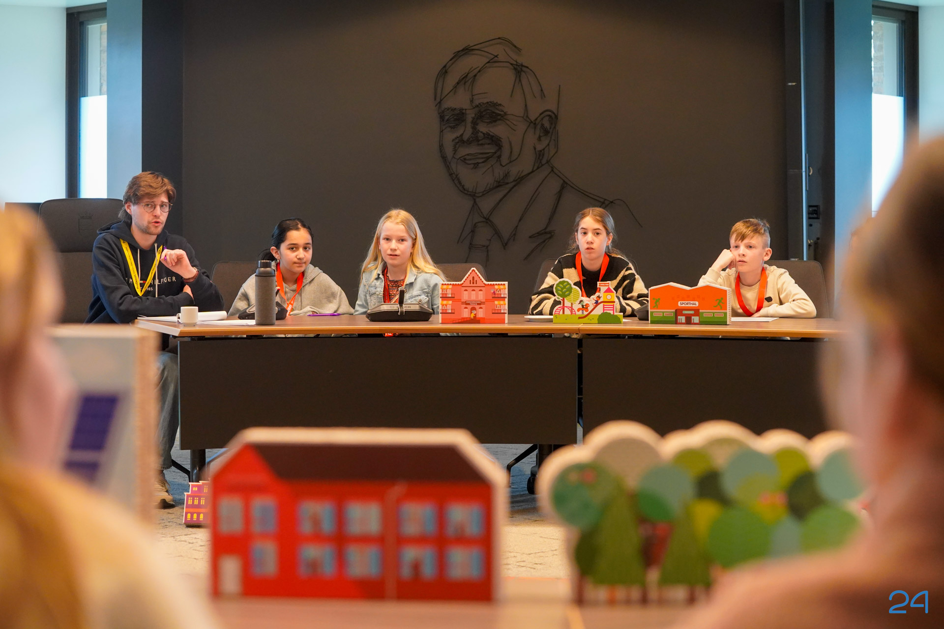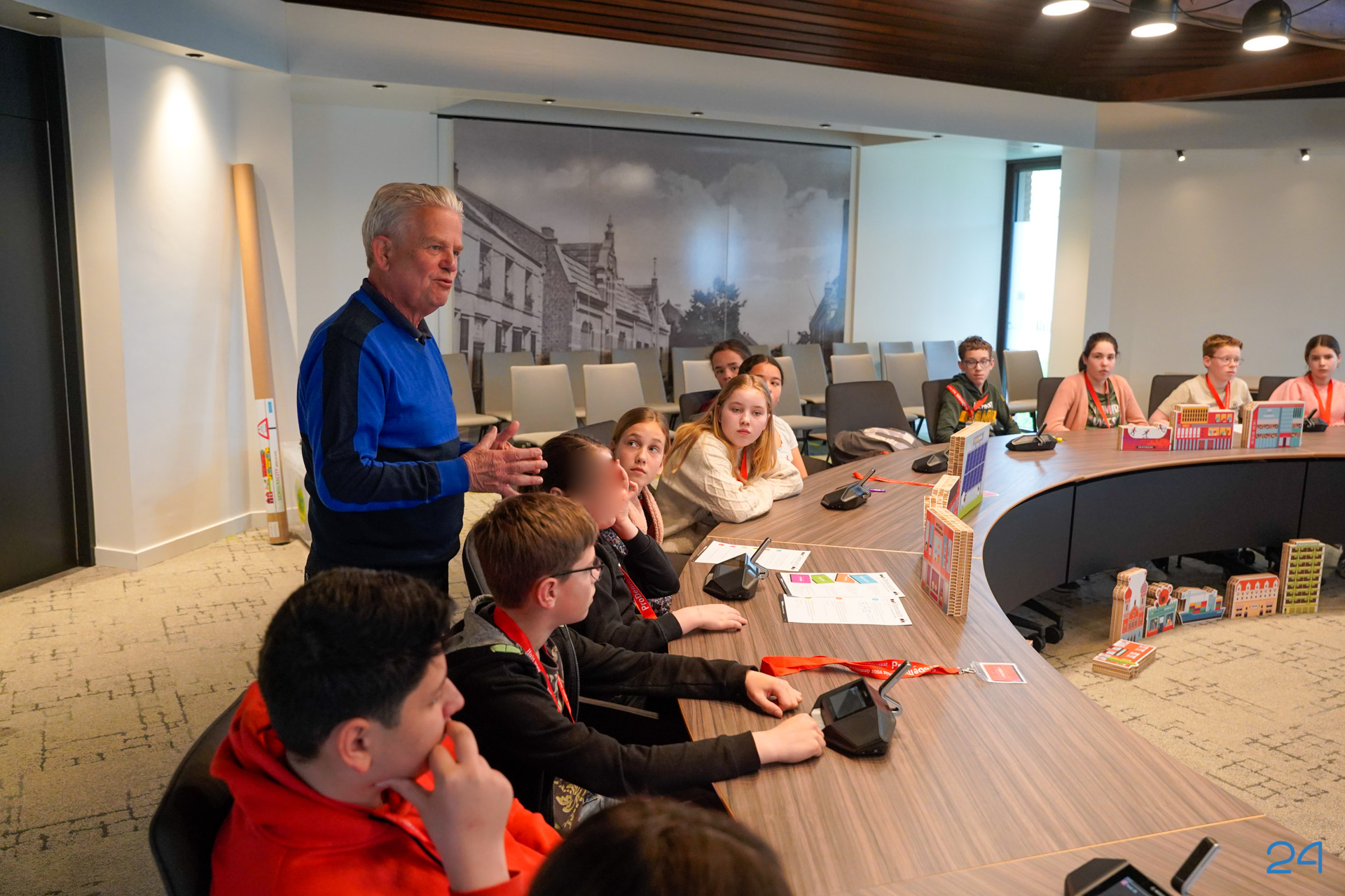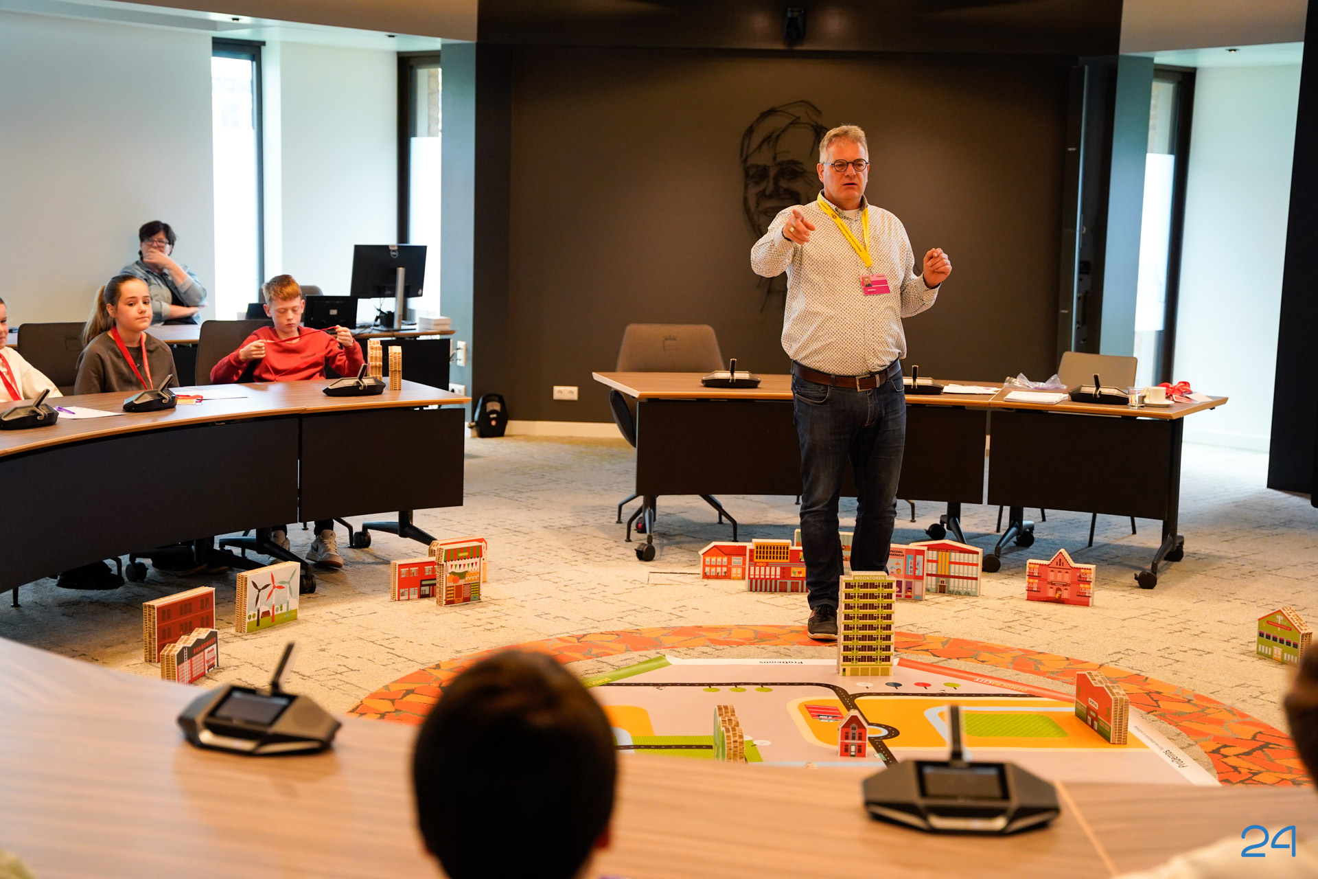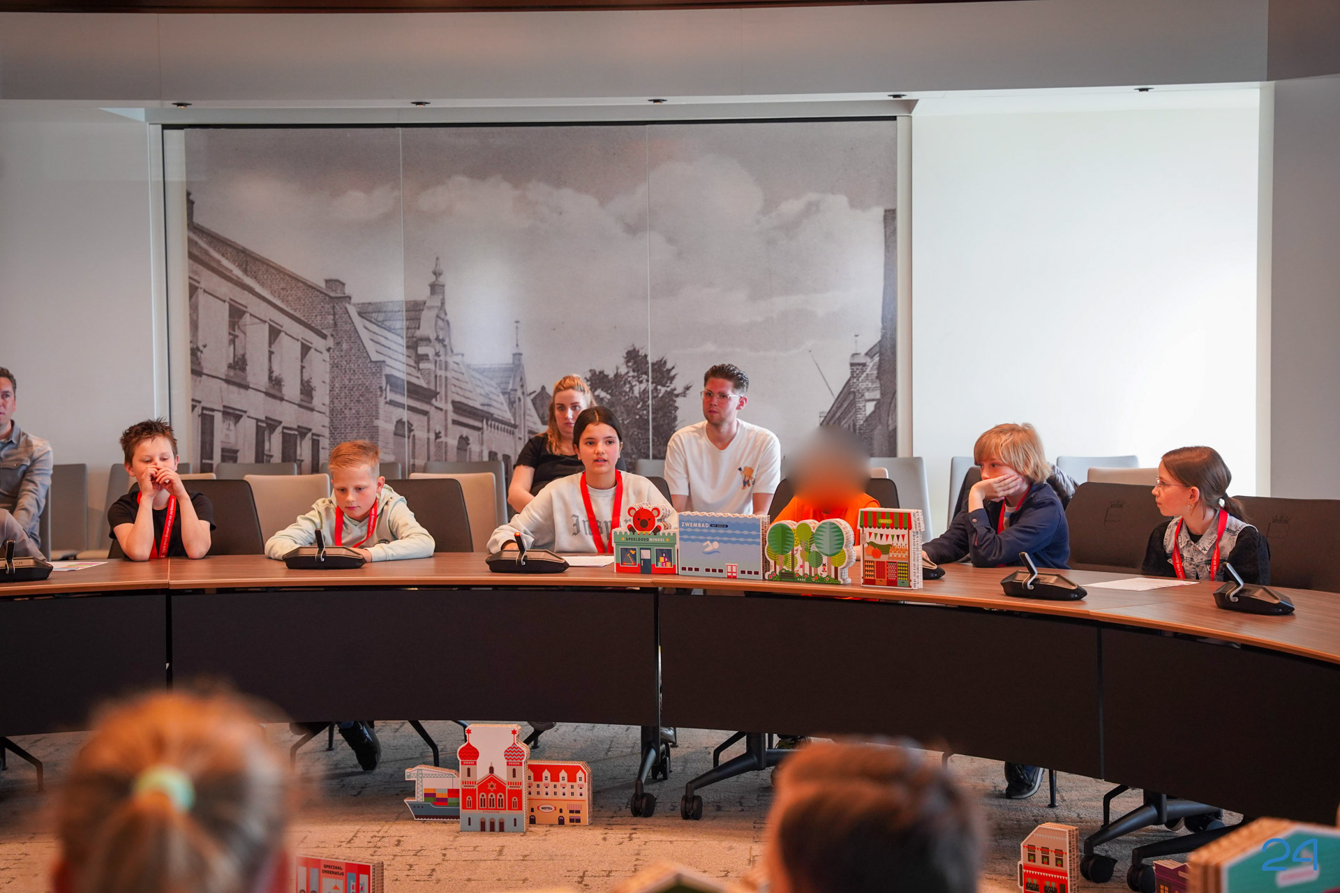 De leerlingen zitten aan de raadsvergadertafel, achter de microfoons. Om hier een beetje aan te wennen zijn we de ochtend gestart met een voorstelrondje. En als tegen twaalven het einde van het spel nadert, is het praten door een microfoon helemaal geen probleem meer. En maar goed ook, want het budget blijkt bijna op te zijn, dus er moet met de andere politieke partijen afgestemd worden welke gebouwen er als laatste een plaats mogen krijgen in de stad. En wil je de andere partijen overtuigen van jouw keuze, dan moet je onderbouwen. Uiteindelijk geeft het tellen van de stemmen de doorslag, en kan de stad afgebouwd worden.