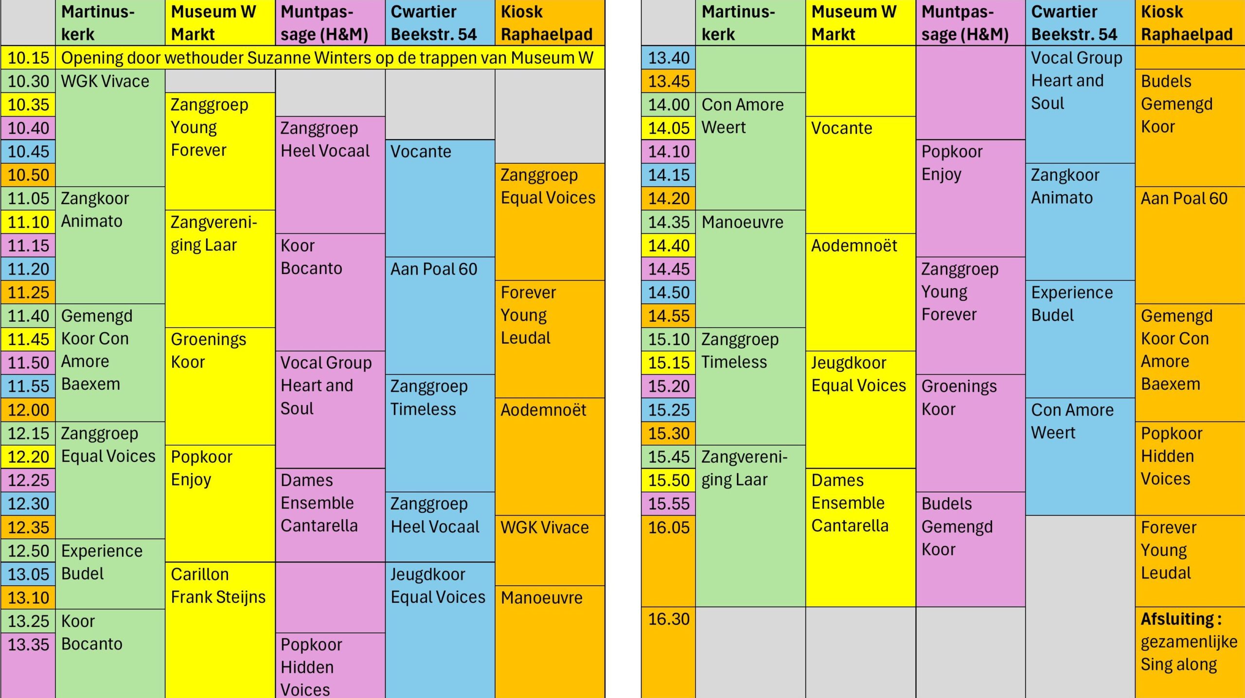 Bij de organisatie is erop gelet dat het aanbod aan koren heel divers is: van pop tot klassiek, van jong tot oud en zowel dames-, heren- als gemengde koren zullen van zich laten horen. Zo is er voor iedereen wel iets naar zijn/haar smaak bij.