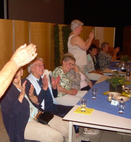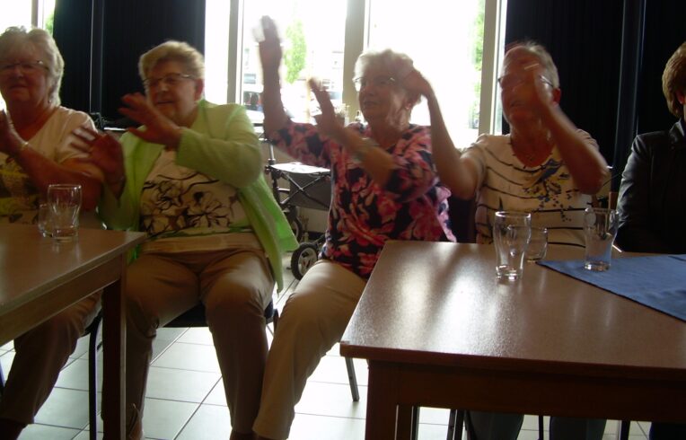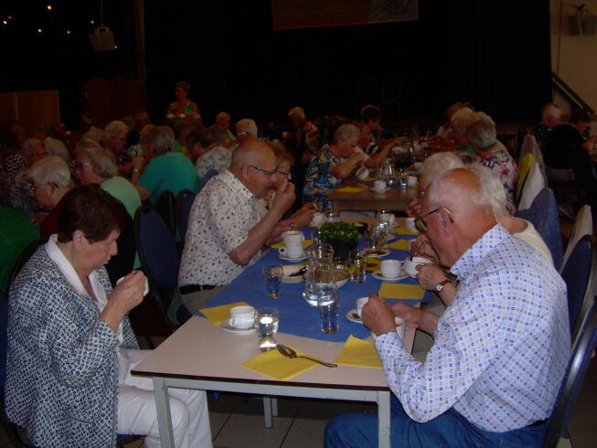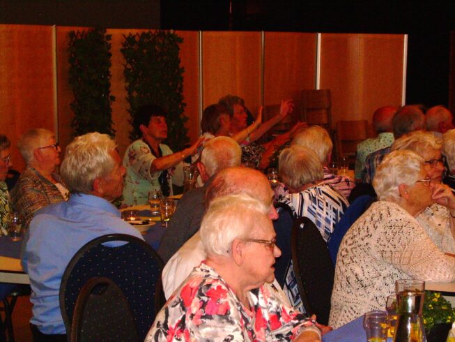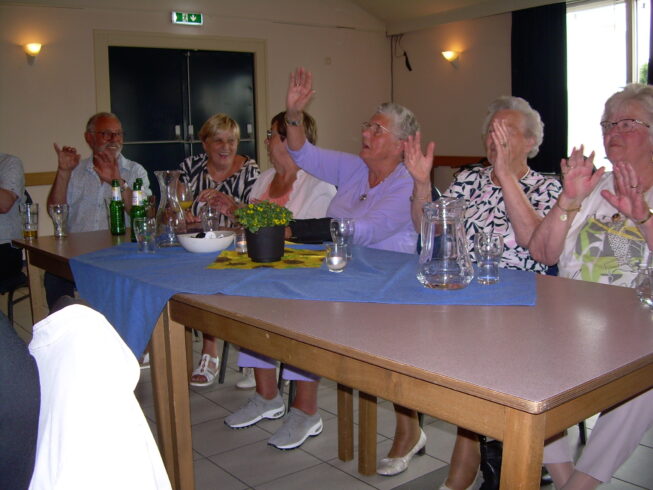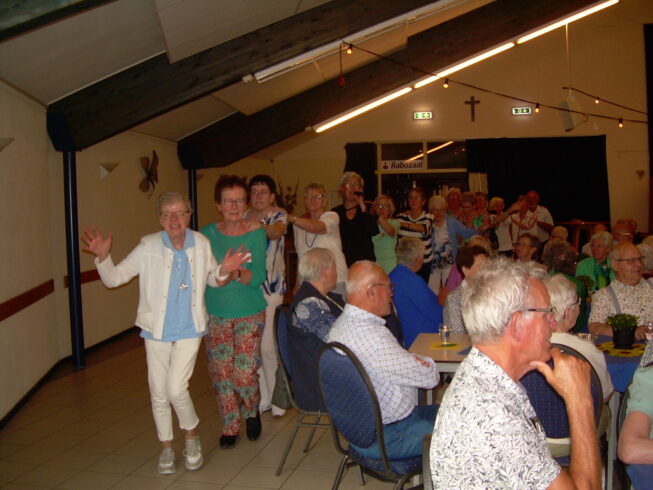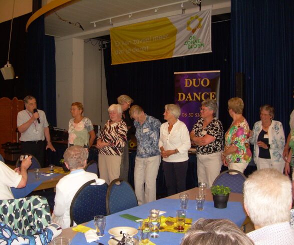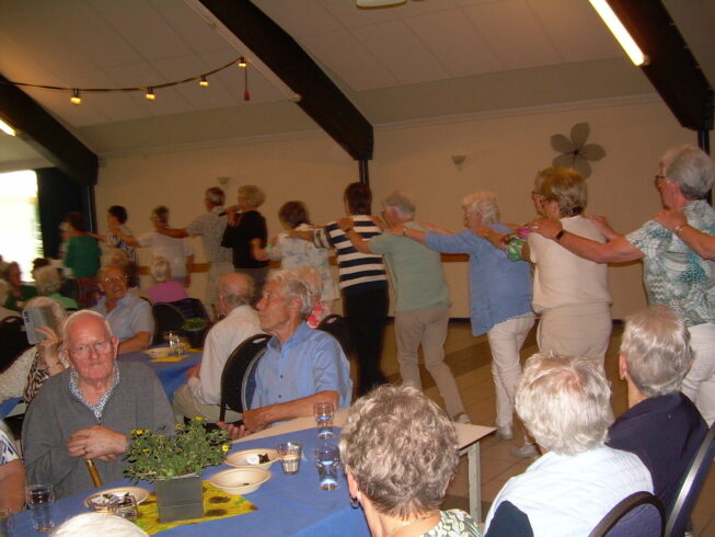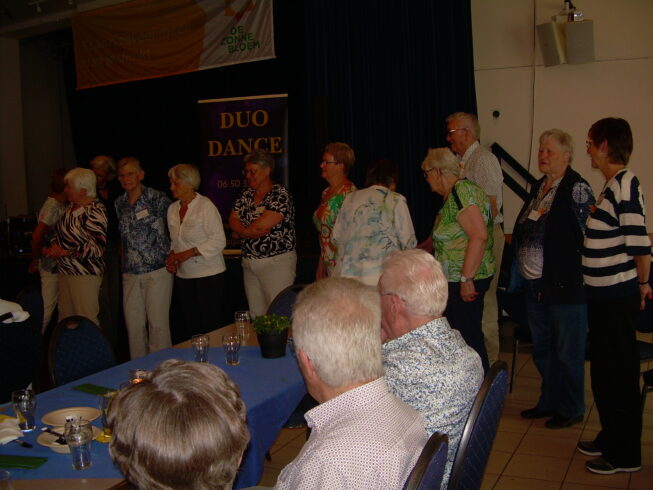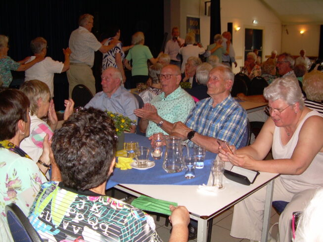 Om de dag een feestelijk tintje te geven was er ’s middags een optreden van ‘Duo Dance’ met voor iedereen herkenbare liedjes. De stemming zat er snel in. Na de eerste klanken kwam al gauw een polonaise op gang en er werd gesjoenkeld en gedanst. Nog even een rustmomentje voor een lekker stuk vlaai om dan weer verder te gaan met het tweede gedeelte. “Iedereen had het zichtbaar goed naar zijn zin en we kunnen terug kijken op een geslaagde ontmoetingsdag”, aldus de Zonnebloem.